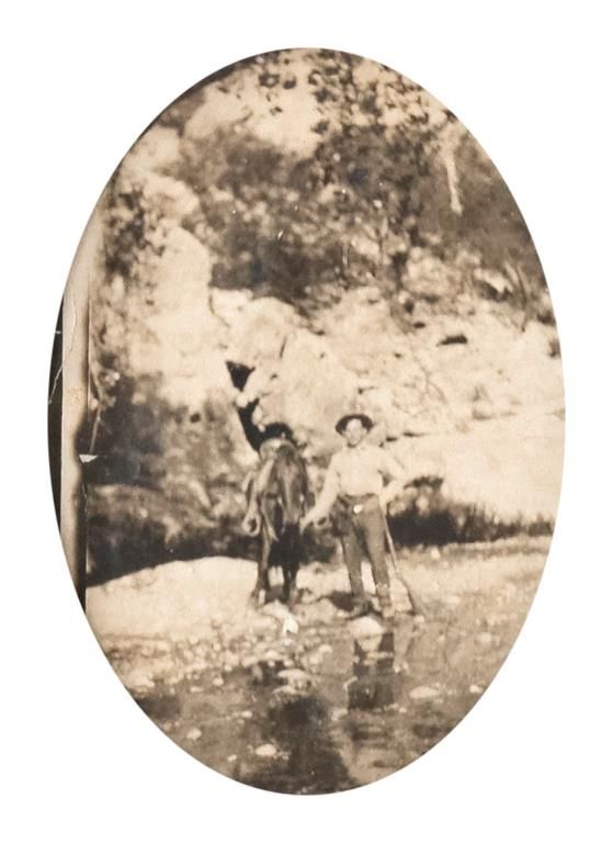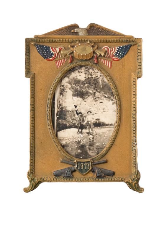 Patriotic Metal colored desk top frame dated 1917 with old photo of a cowboy with horse, approx. 8-1/2” x 6” in overall good condition (rear swivel stand leg missing). Est.: $100-$200.