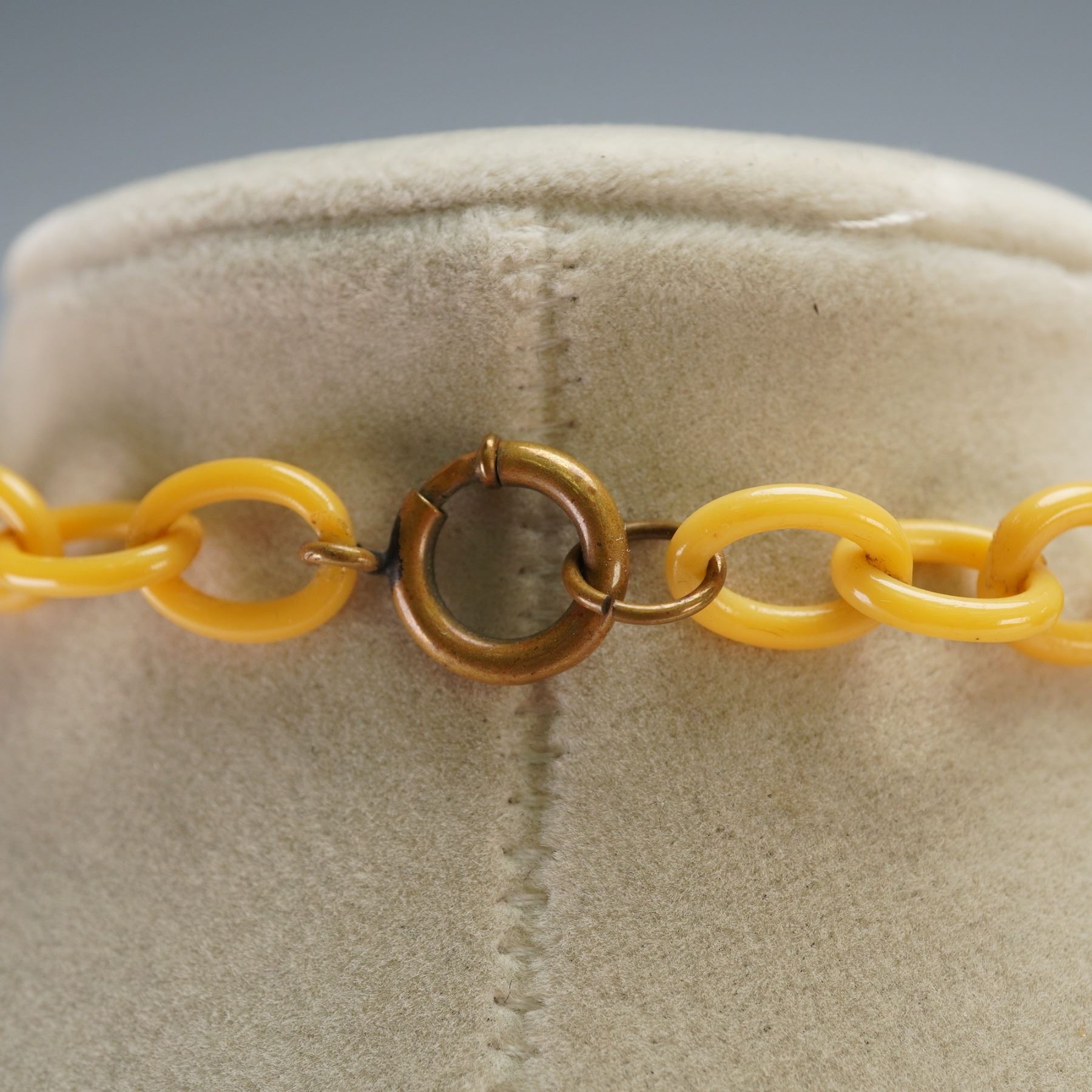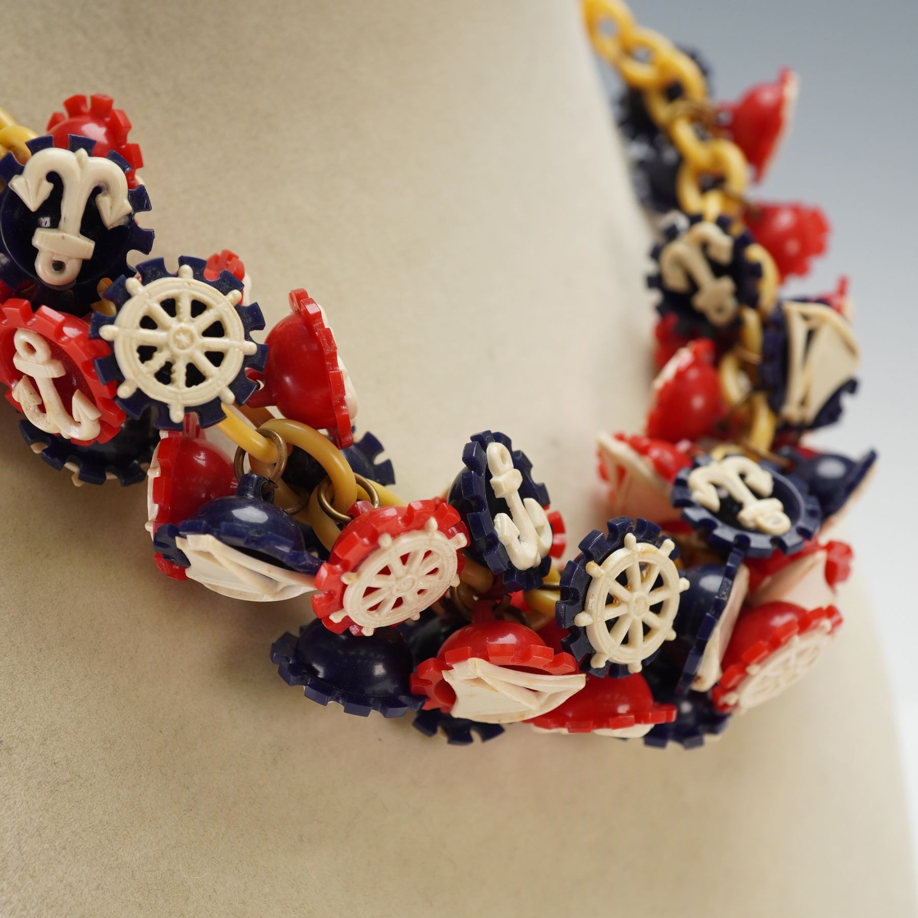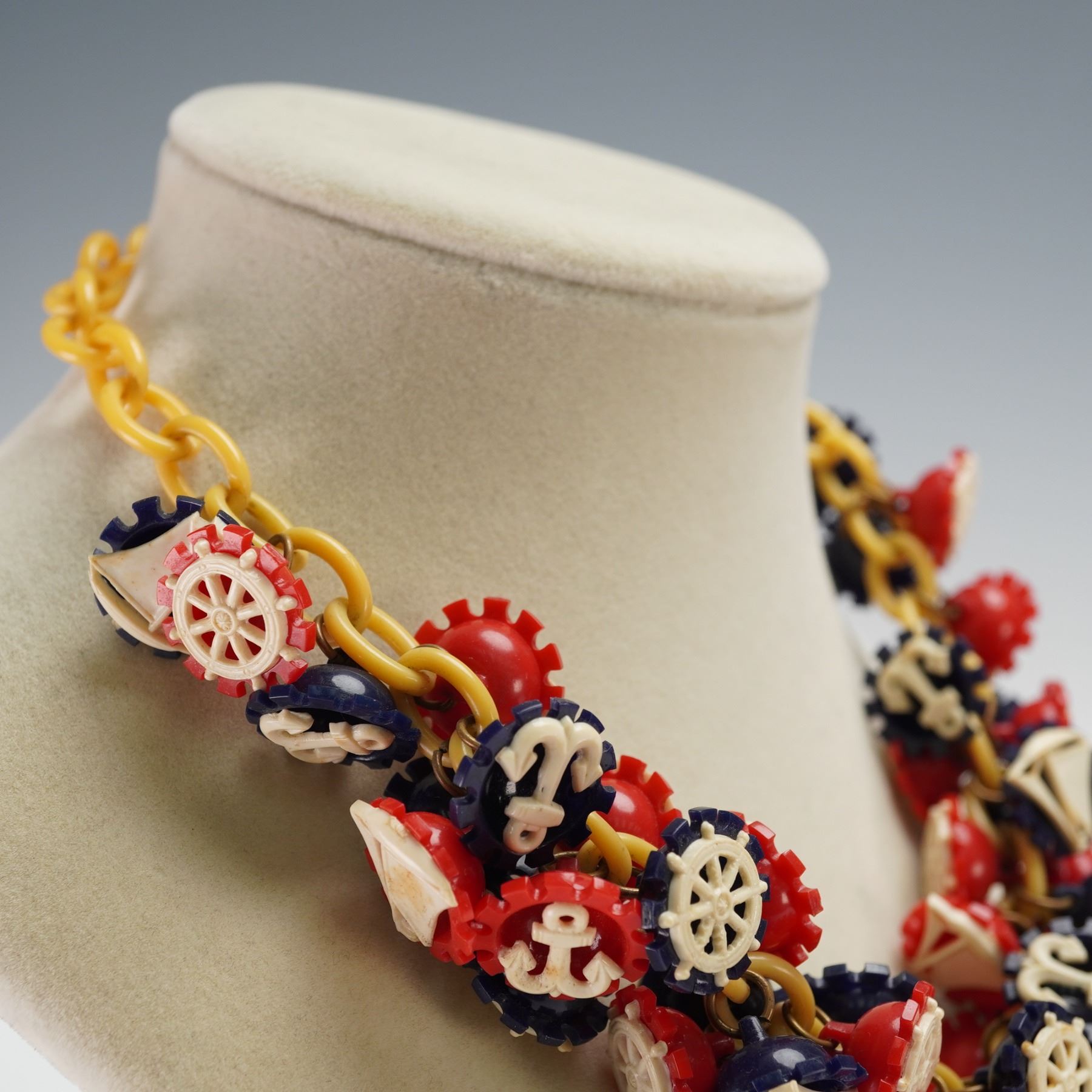 Vintage patriotic red, white, and blue celluloid necklace featuring nautical-themed charms including anchors, ship wheels, and sailboats suspended from a linked yellow celluloid chain. The whimsical design captures a classic mid 20th century maritime motif, evoking seaside style and Americana flair. Finished with a spring ring clasp.