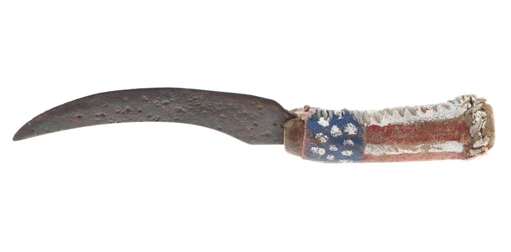 The lot features an old iron skinning knife with hardwood grip covered in parfleche with a polychrome painted Patriotic finish. The knife shows an iron blade with curved blade, used for skinning hide and has hardwood one piece handle, an older antique knife with later added Plains style grip showing a rawhide parfleche wrap with USA painted red, white and blue painted flag. Measures overall 9.5"L.
