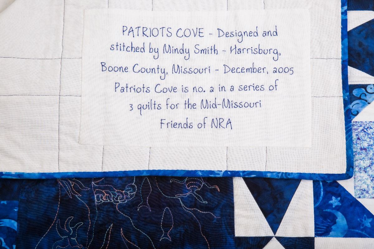 Patriots Cove is number 2 in a series of 3 quilts originally made for the Mid-Missouri Friends of NRA. Queen-size, 91x84 quilt designed and handcrafted by textile/mixed media artist and teacher Mindy Smith.