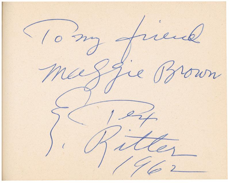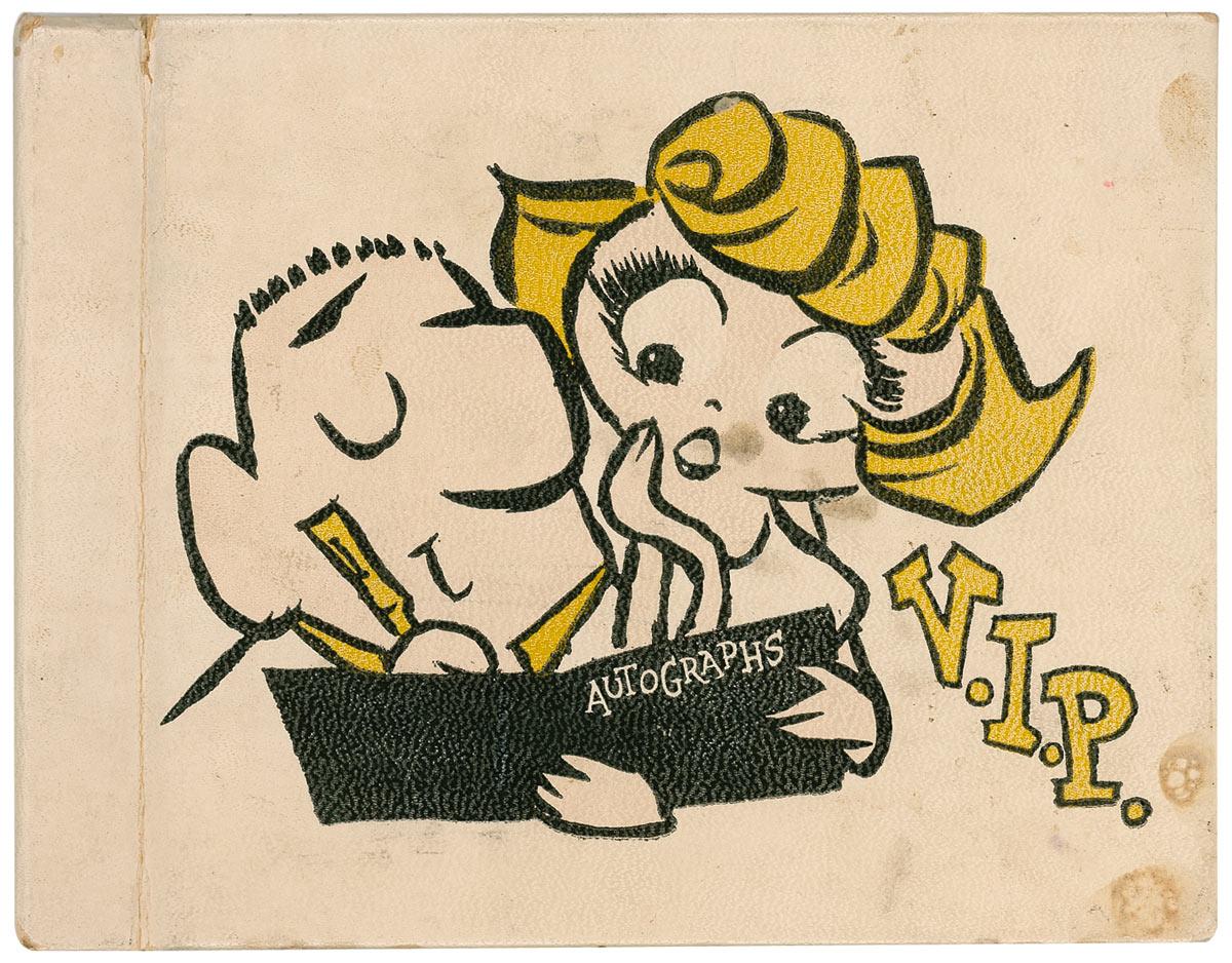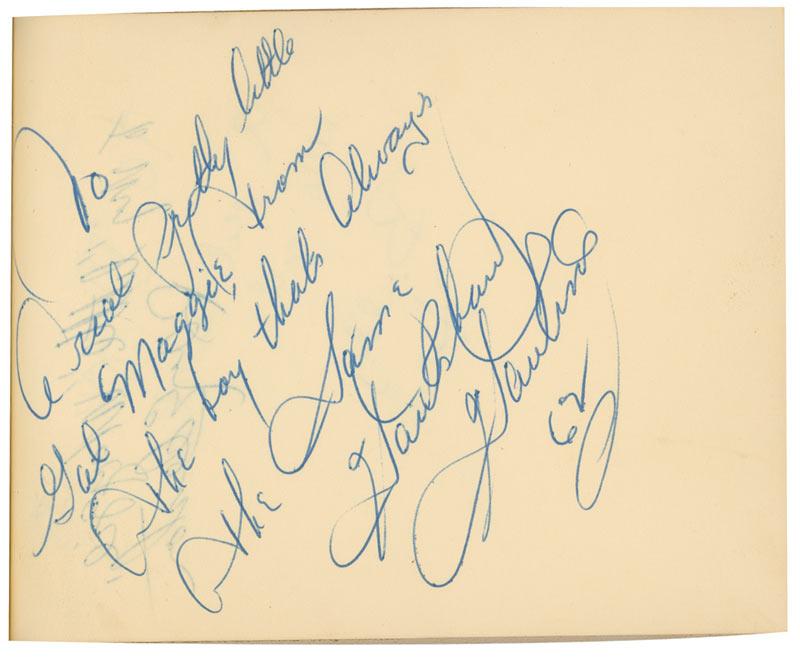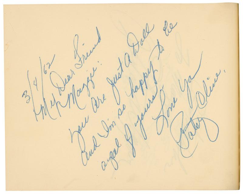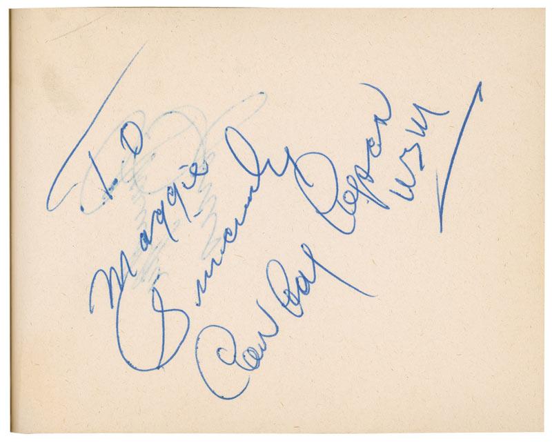 Vintage hardcover autograph album, 6.25 x 4.75, circa 1962, signed inside by several country music stars. Signers include: Patsy Cline (“3/4/62 My Dear Friend Maggie, You are just a doll and I’m so happy to be a pal of yours. Love ya, Patsy Cline”), Cowboy Copas (”To Maggie, Sincerely, Cowboy Copas, WSM”), Hawkshaw Hawkins (”To a real pretty little gal Maggie from the boy that’s always the same. Hawkshaw Hawkins 62”), Tex Ritter, Jimmy Dickens, Grandpa Jones, Bill Anderson, Eddy Arnold, Minnie Pearl, and Porter Wagner. Nearly all are inscribed and a few are back-to-back, including Copas. In fine condition. Cline, Copas, and Hawkins were all killed in a 1963 plane crash. Accompanied by two unsigned candid photos of Cline.
