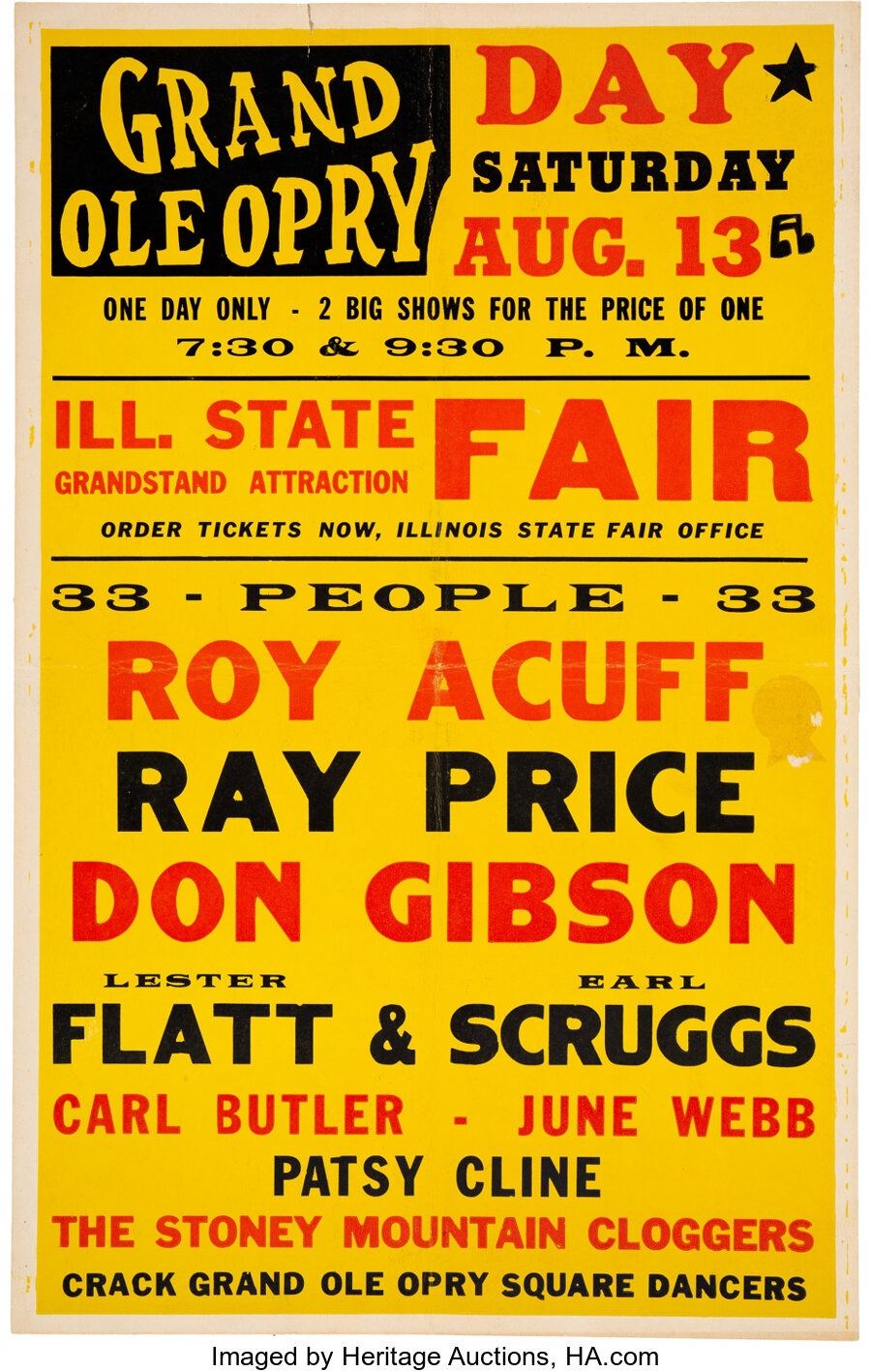 Patsy Cline, Flatt Scruggs, Roy Acuff, Ray Price 1960 Illinois Concert Poster.An original cardboard window card advertising 33 musicians playing at a "Grand Ole Opry Day" at the Illinois State Fair on Saturday, August 13, 1960. There's lots of great talent on this board, but Patsy Cline always steals the show whenever she appears, and that's the case here... way down at the bottom. Made by the Hatch Show Print company out of Nashville, TN. It measures 13 7/8" x 21 3/4" and grades to Very Good condition. COA from Heritage Auctions.