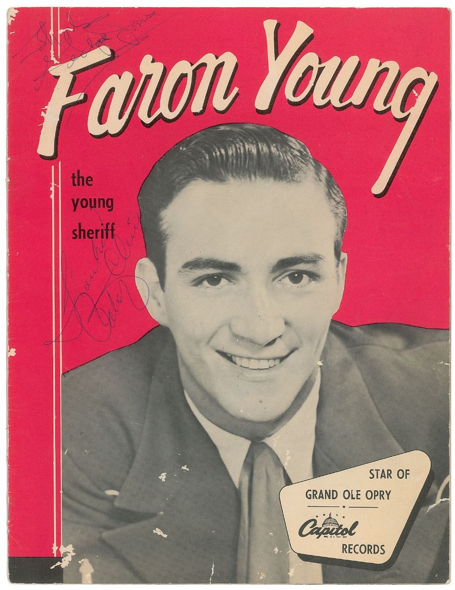 Souvenir tour program from a Faron Young concert, 8.25 x 11, signed on the front cover in blue ballpoint, “Thanks, Patsy Cline,” and “Thanks, George Jones,” and signed and inscribed inside on his full-page portrait, “To Faron Hengst, Be sweet, Faron Young.” In very good to fine condition, with some scattered light surface loss to front cover, a few small edge tears, and light handling wear. Accompanied by a letter of provenance from the original recipient which reads, in part: “My name is Faron Hengst, when I was 1 year old in 1960 my parents went to the New Mexico State Fair to see Faron Young, Patsy Cline & George Jones perform…I was named after Faron Young so my parents took me…After the show they took me up to get autographs of all 3 stars. They told Faron Young that they had named me after him because they loved his music so much, my mom told me Patsy Cline held me while Faron & George Jones signed this book.”