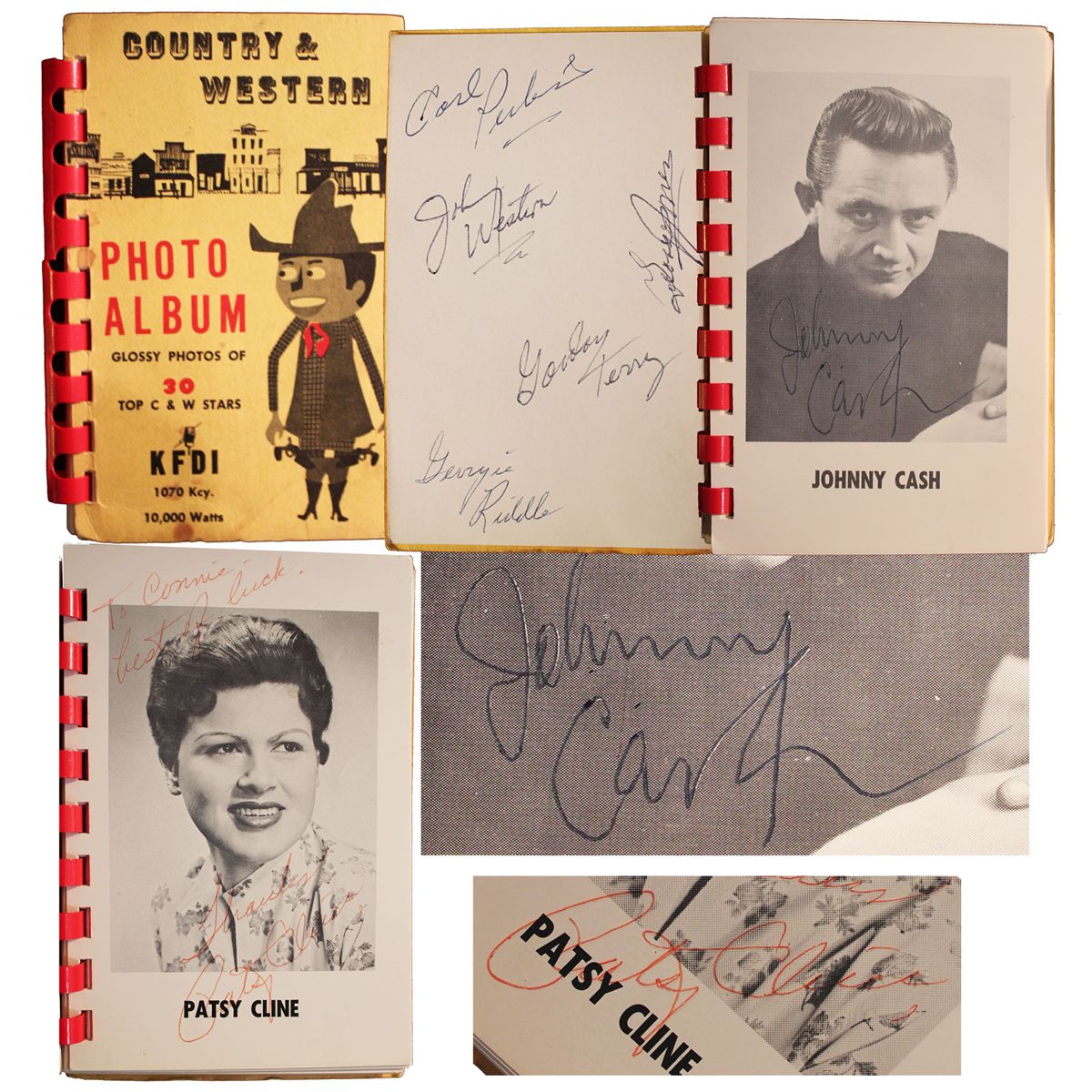 Pocket-sized Country and Western photo album with a personalized signature by Patsy Cline plus signatures by Johnny Cash, George Jones and four other stars. Album depicts Cline, Cash and 28 other singers in photographs. Cline signs ''To Connie -- best of luck. Thanks, Patsy Cline''. Johnny Cash also signs his name on his page. Album also signed by George Jones, Carl Perkins, Johnny Western, Gordon Terry and Georgie Riddle. 31pp. album measures 3.25'' x 5'' including vintage front and back covers, red comb-bound. Very good condition.