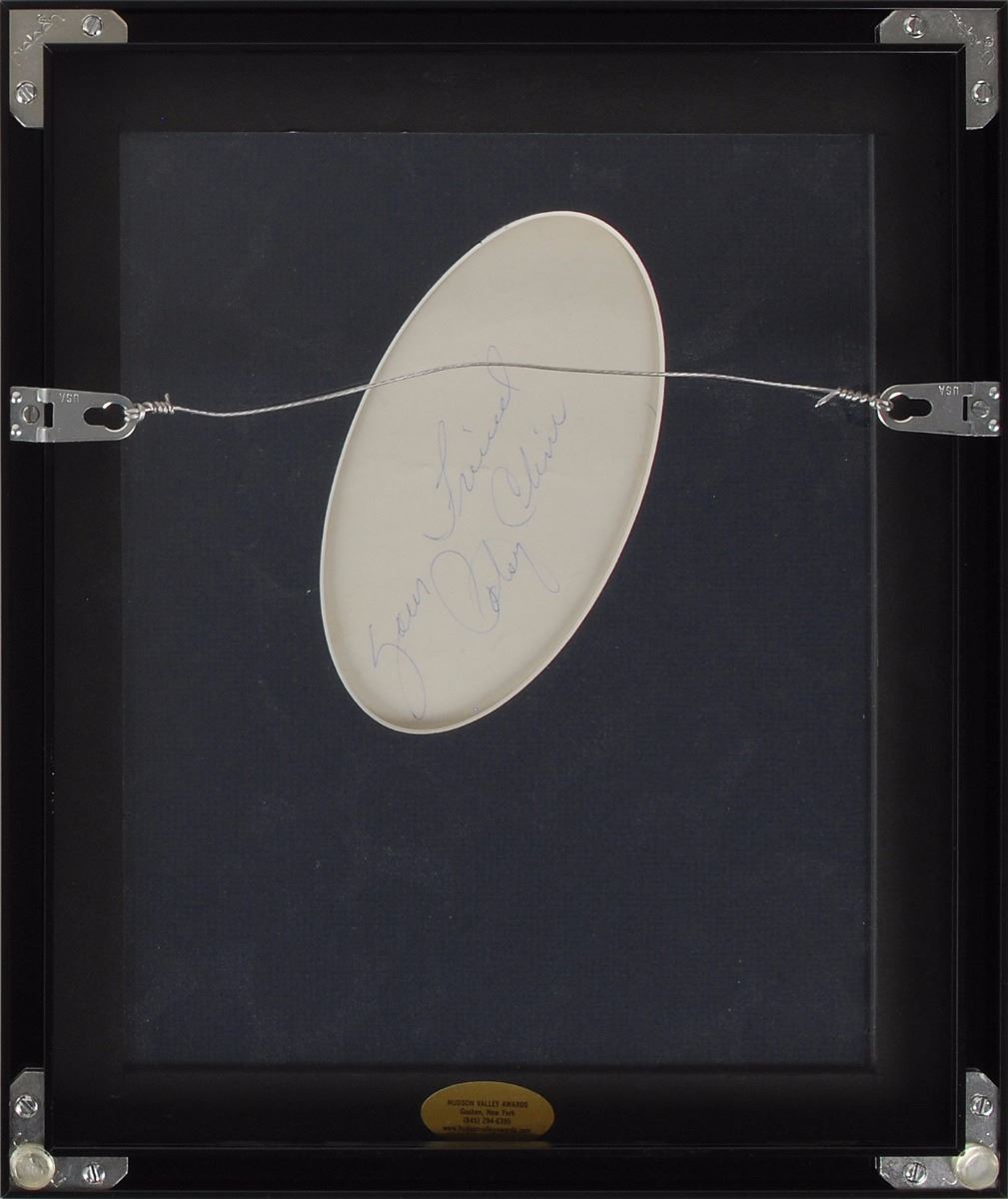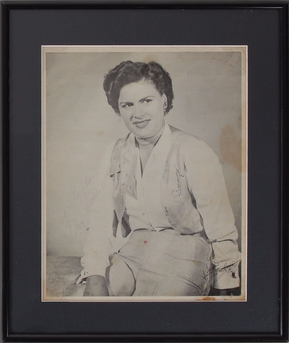 Attractive vintage 8 x 9.75 cardstock portrait of Cline in Western attire, signed in blue ink, “Many thanks, “Patsy Cline,” and signed again on the reverse in blue ballpoint, “Your friend, Patsy Cline.” Matted and framed, with a viewing window on the reverse. In very good condition, with scattered creases and surface marks, several areas of staining to image side, primarily to edges and background, some light creases and toning to reverse, and small area of paper loss to one edge. The portrait was taken at Lamp’s Photography in Winchester, Virginia, Cline’s hometown.