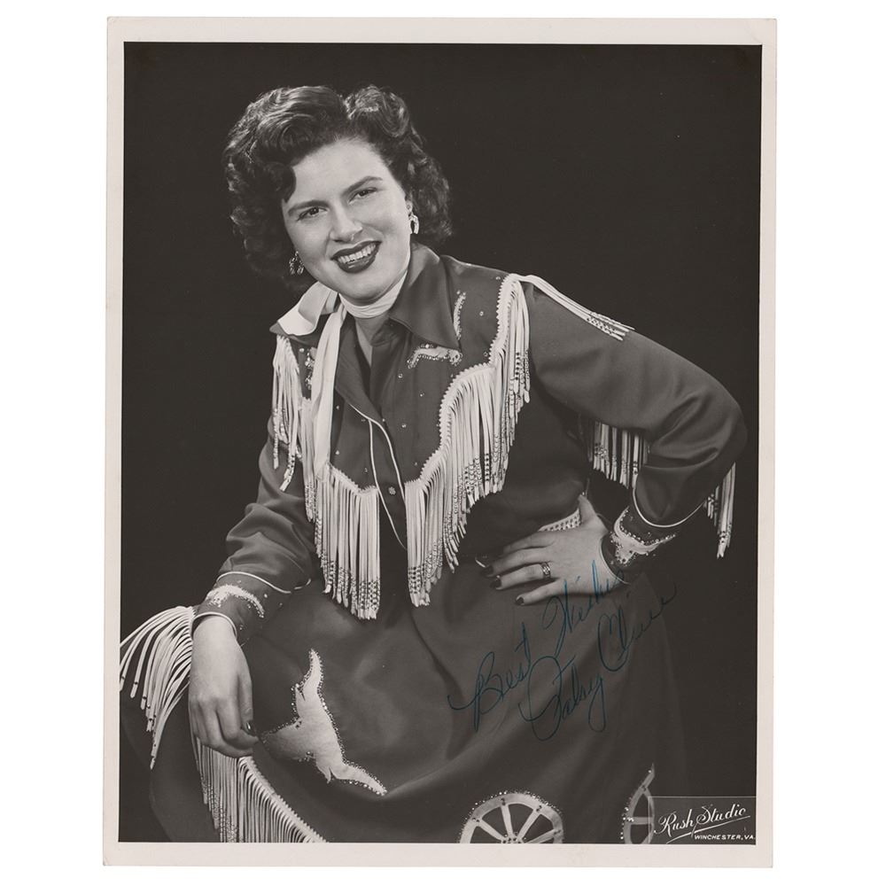 Vintage glossy 8 x 10.25 photo of Patsy Cline by the Rush Studio of Winchester, Virginia, signed in blue ballpoint, "Best wishes, Patsy Cline." In fine condition, with surface impressions on the signature area from another item signed on top of this one.