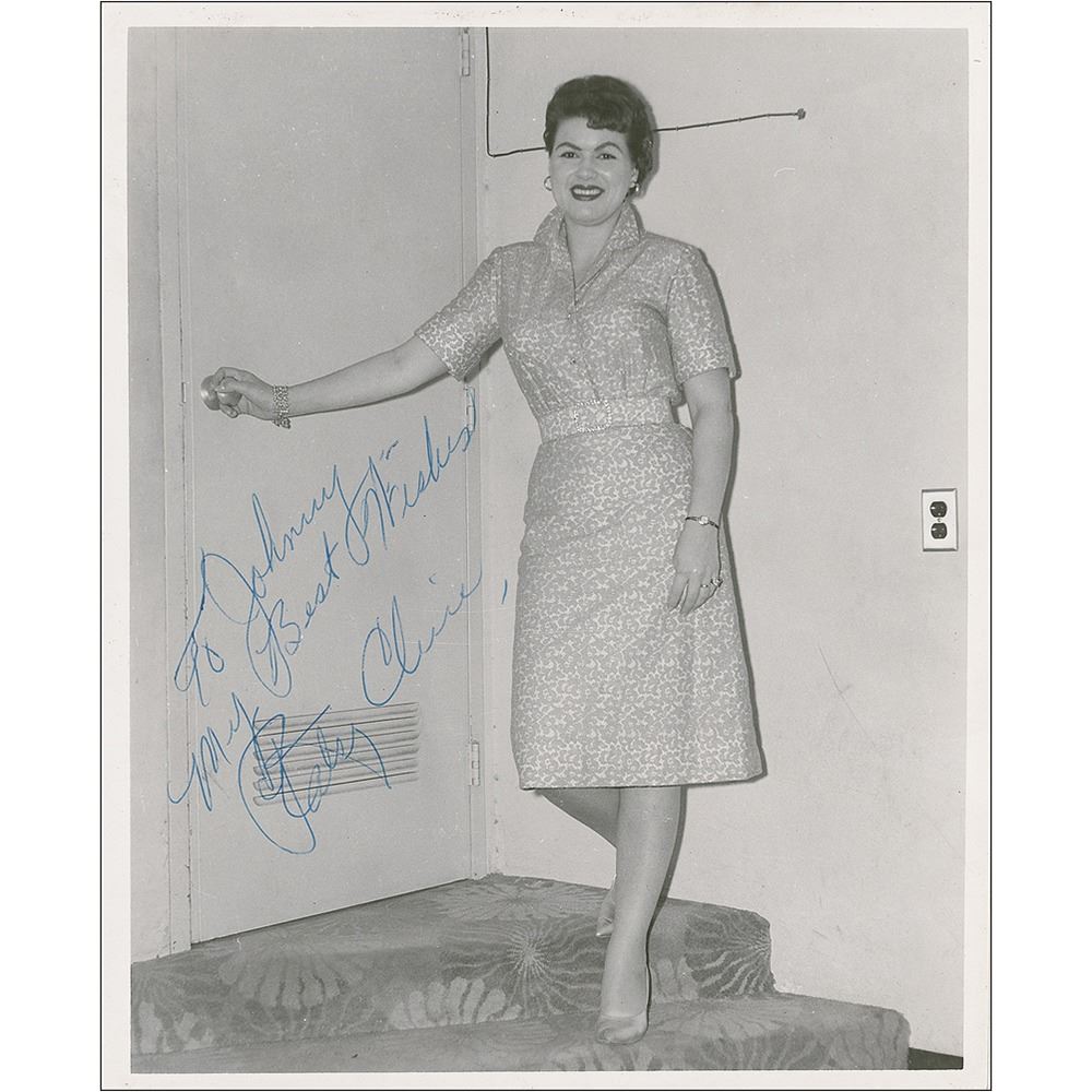 Vintage glossy 8 x 10 full-length photo of Patsy Cline wearing a floral print dress and posing on a small set of stairs, signed and inscribed in blue ballpoint, "To Johnny, My best wishes, Patsy Cline." In fine condition, with scattered light creasing. A boldly signed and scarce pose of the country music legend.