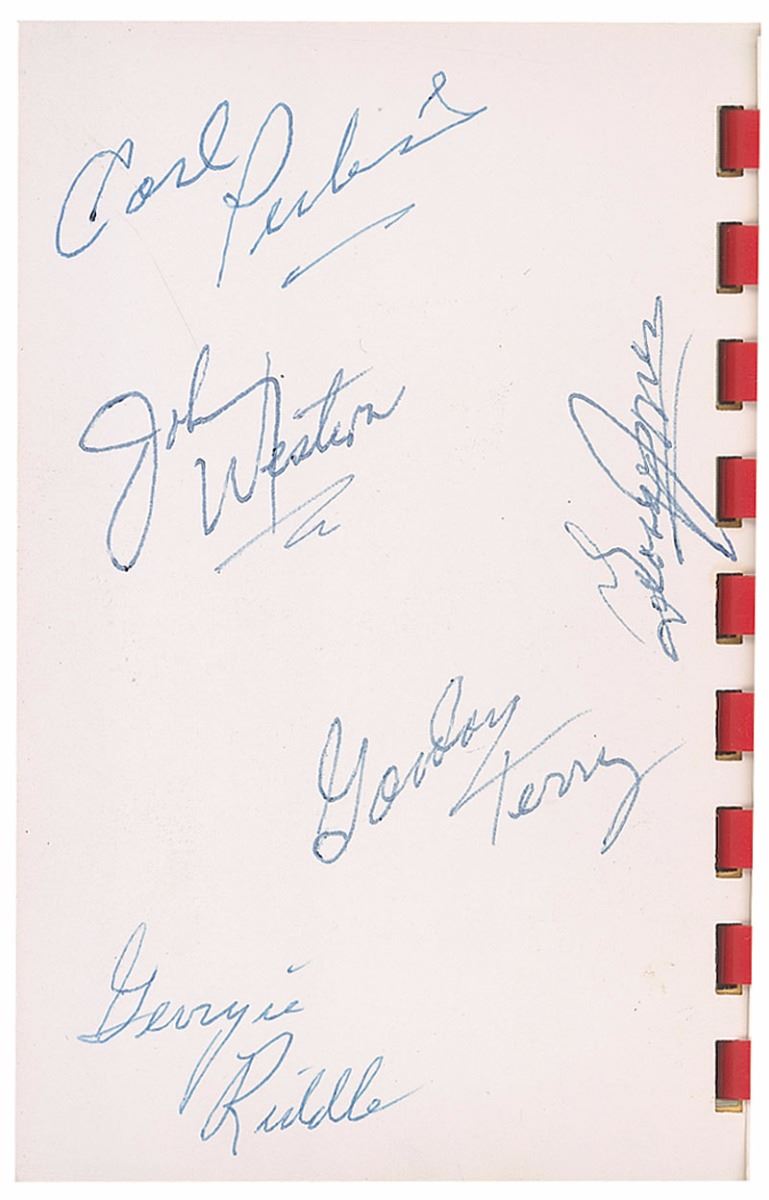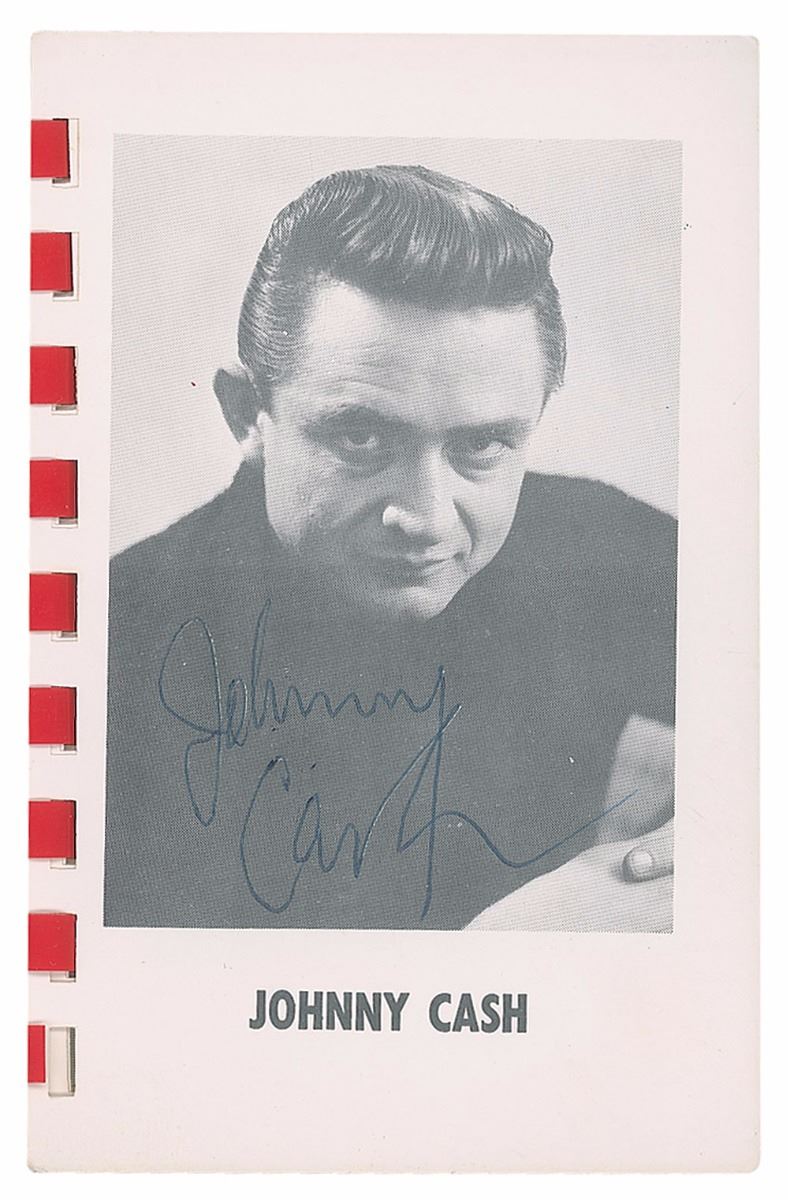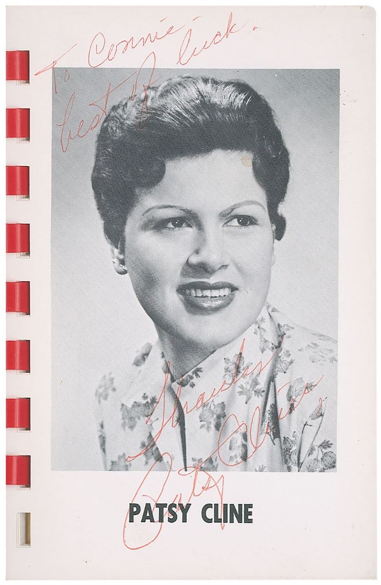 Vintage pocket-sized photo album of ‘Country & Western’ stars distributed by the KFDI radio station, 3.5 x 5, signed and inscribed in red ballpoint on the page with Cline’s image, “To Connie—best of luck. Thanks, Patsy Cline,” and on Cash’s page in blue ballpoint, “Johnny Cash.” Also signed on the reverse of the first page in blue ballpoint by Carl Perkins, Johnny Western, George Jones, Gordon Terry, and Georgie Riddle. In fine condition.