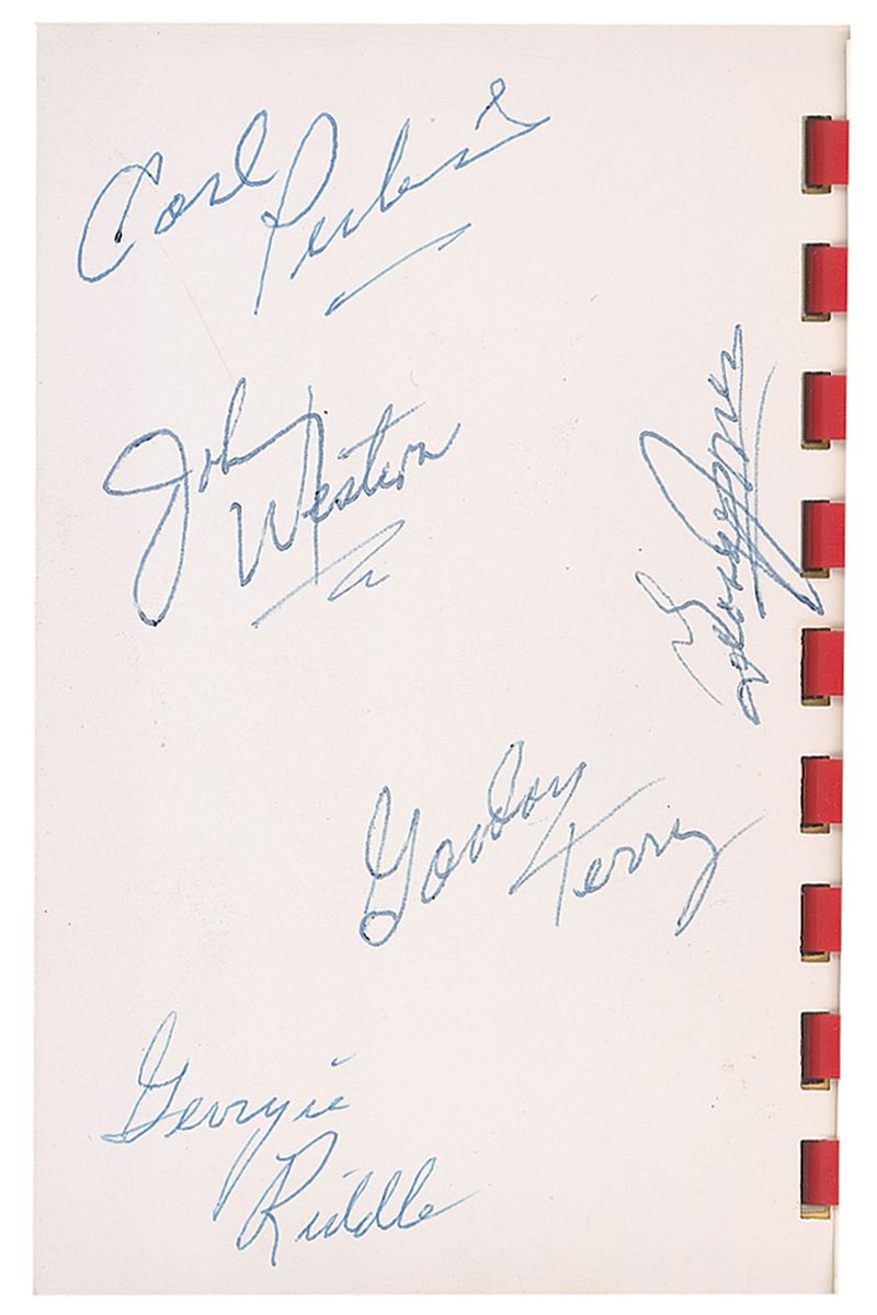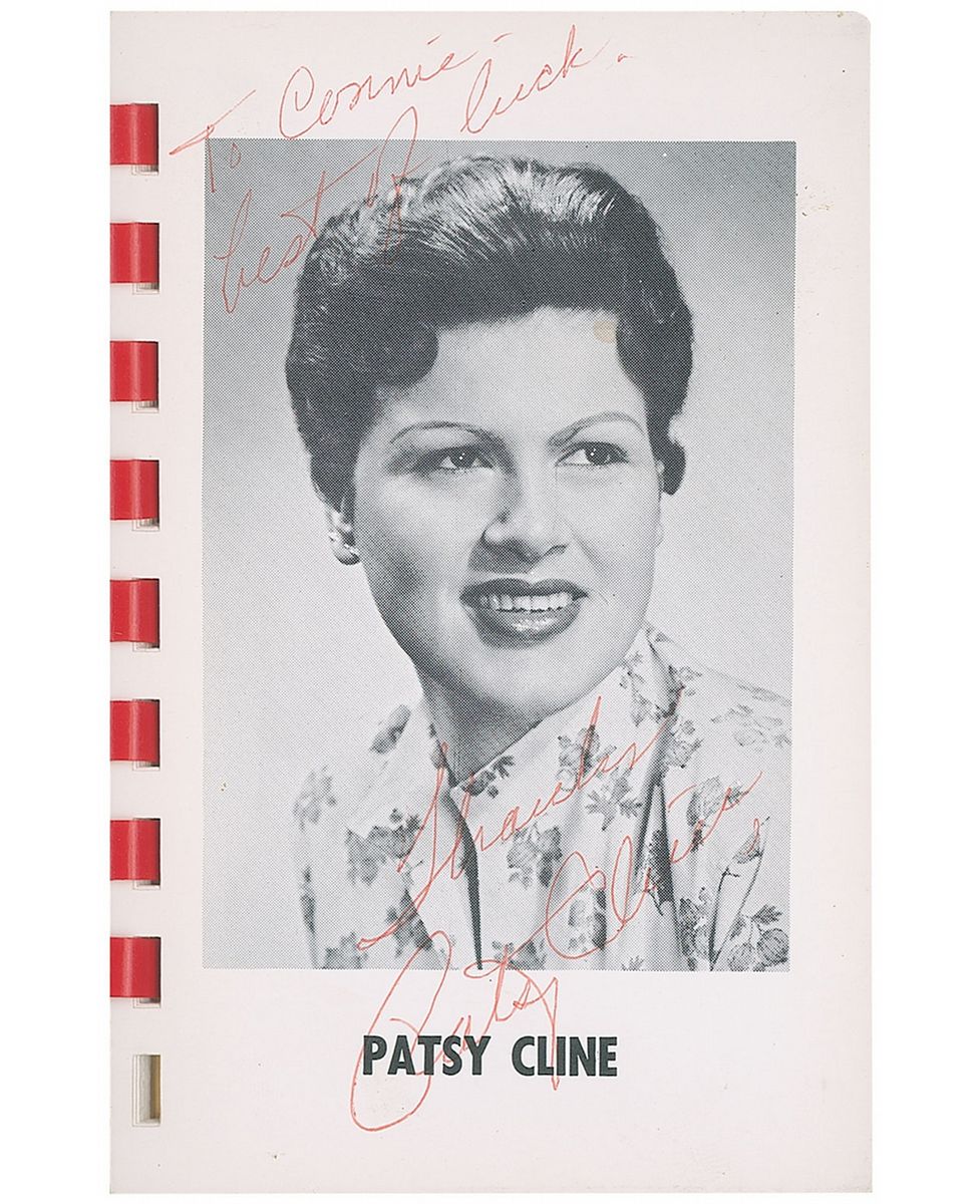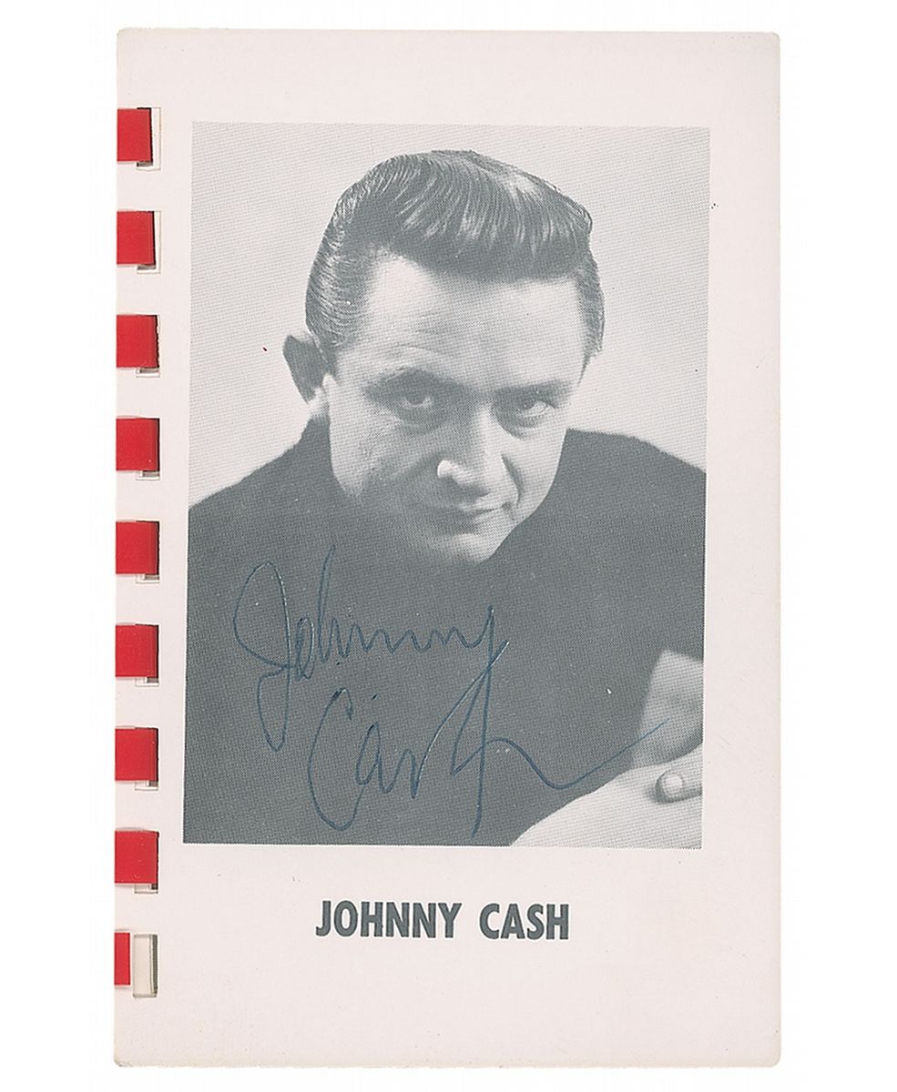 Vintage pocket-sized photo album of ‘Country & Western’ stars distributed by the KFDI radio station, 3.5 x 5, signed and inscribed in red ballpoint on the page with Cline’s image, “To Connie—best of luck. Thanks, Patsy Cline,” and on Cash’s page in blue ballpoint, “Johnny Cash.” Also signed on the reverse of the first page in blue ballpoint by Carl Perkins, Johnny Western, George Jones, Gordon Terry, and Georgie Riddle. In fine condition, with some slight staining to the cover.