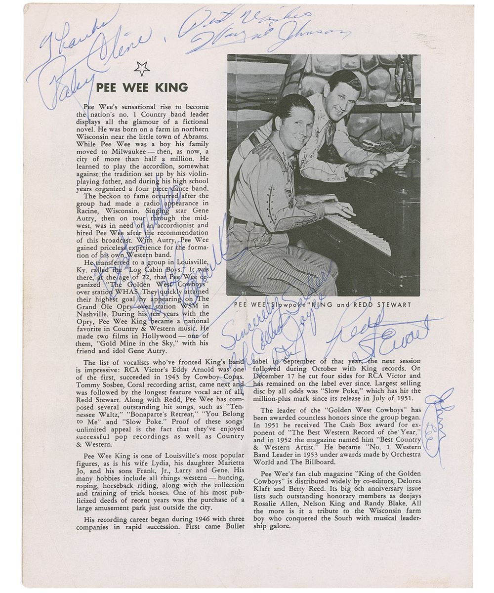 Two adjoined Pee Wee King program pages, 8.5 x 11, one signed at the top in blue ballpoint, “Thanks, Patsy Cline,” with the page also being signed by five others, including Redd Stewart. Back of the opposite page is signed in pencil by Pee Wee King. In fine condition, with central horizontal and vertical fold, and some scattered light soiling and creasing.