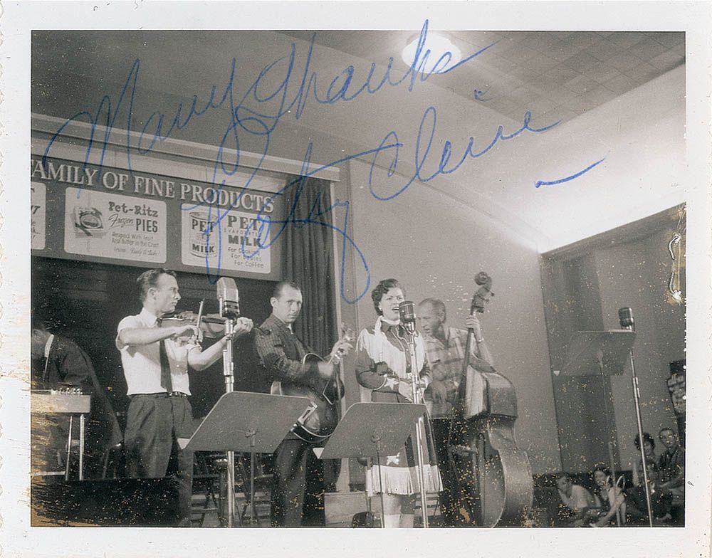 Vintage glossy 4 x 3.25 candid photo of Cline and her band performning, signed in blue ballpoint, “Many thanks, Patsy Cline.” A staple to right side and some mild spotting and finish wear to lower portion of image, otherwise fine condition.