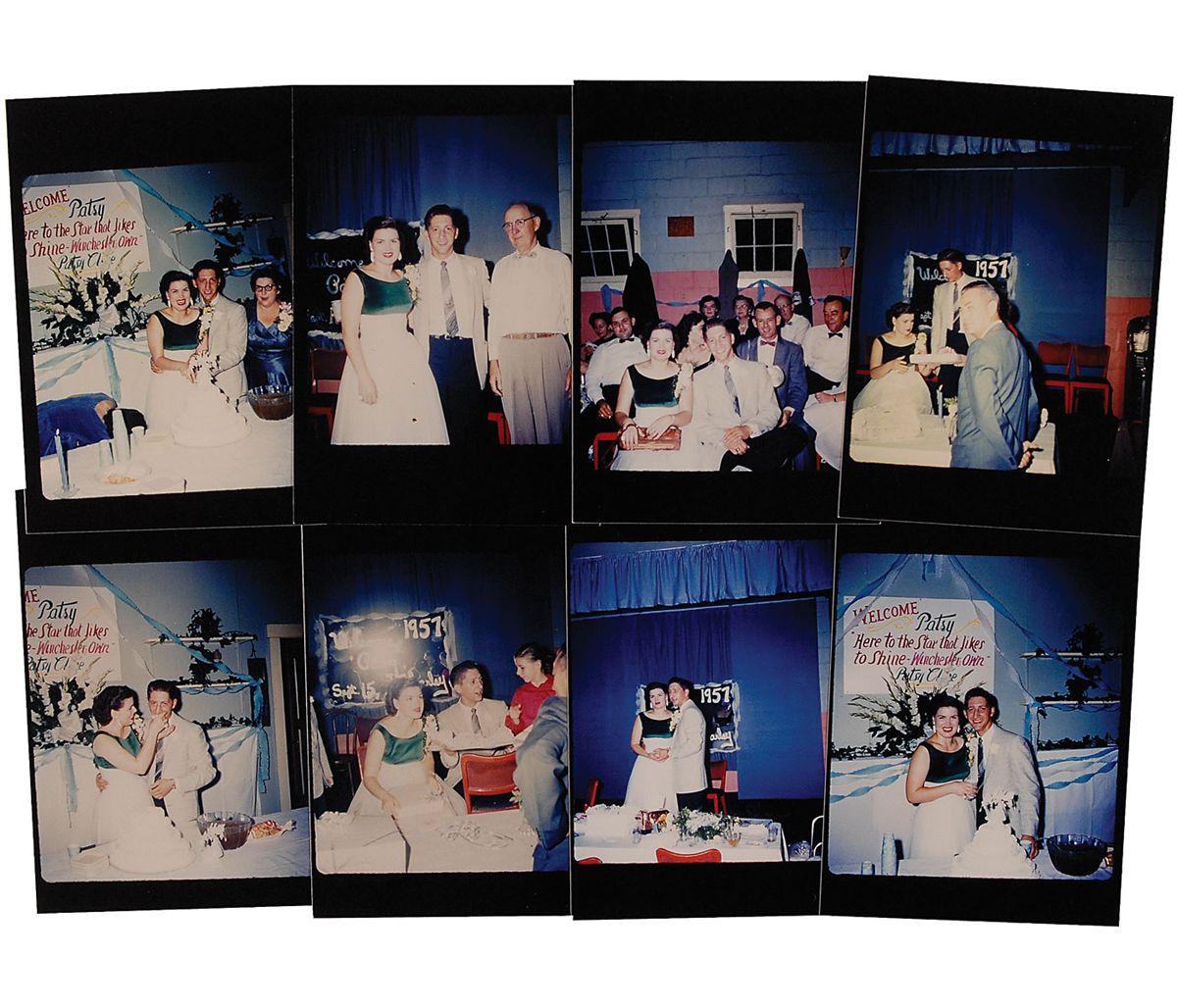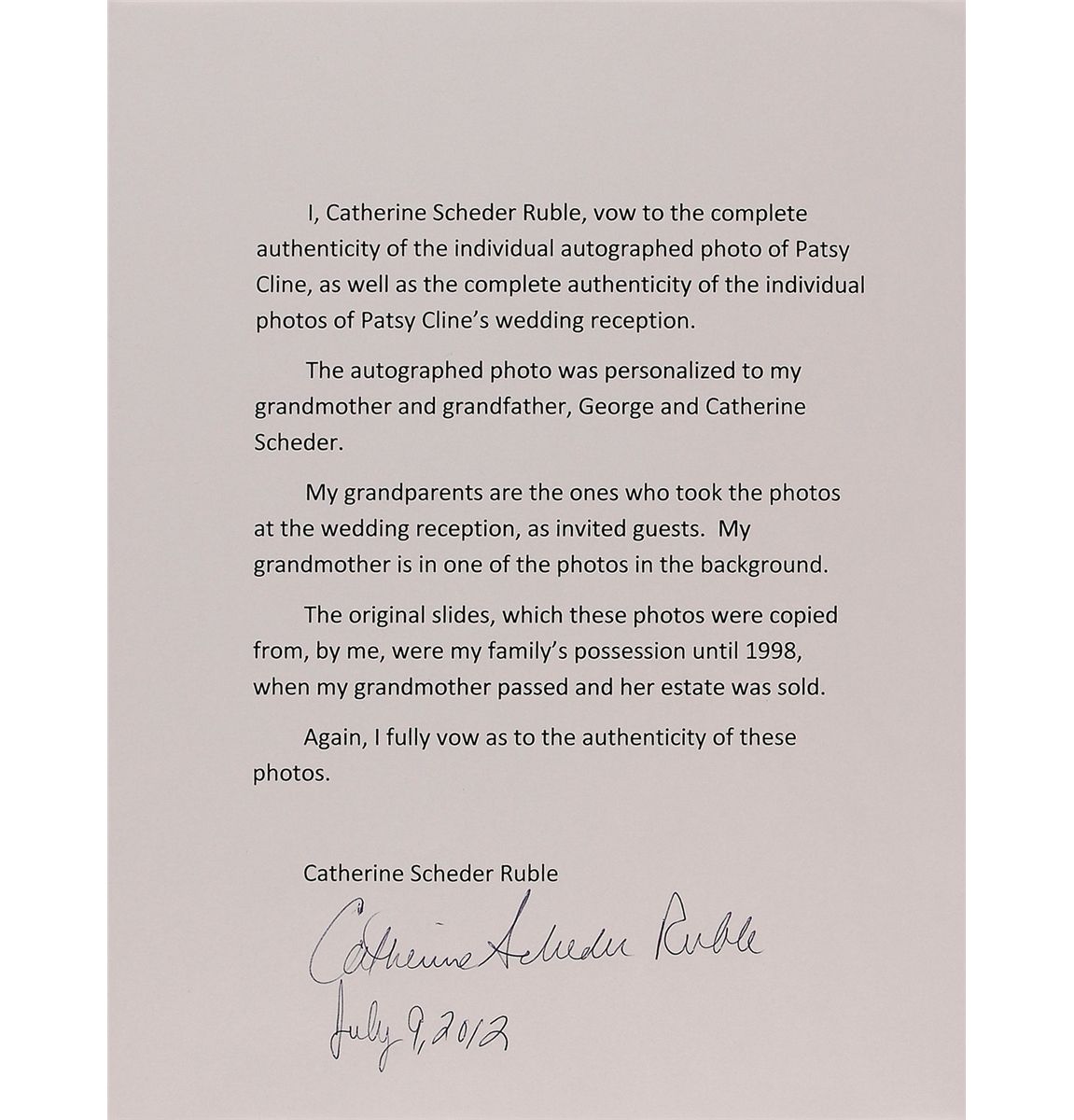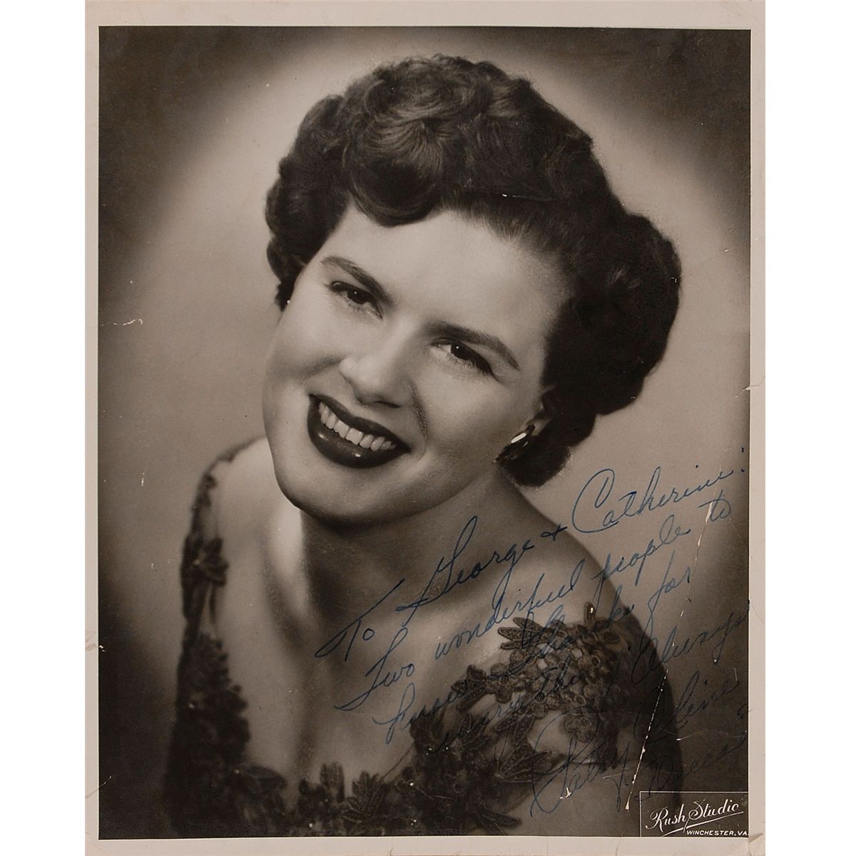 Vintage glossy 8 x 10 Rush Studio portrait, signed and inscribed in fountain pen “To George & Catherine: Two wonderful people to know. Thanks for everything. Always, Patsy Cline, ‘Decca.’” Affixed to a heavier sheet of the same size. Heavy scattered creas