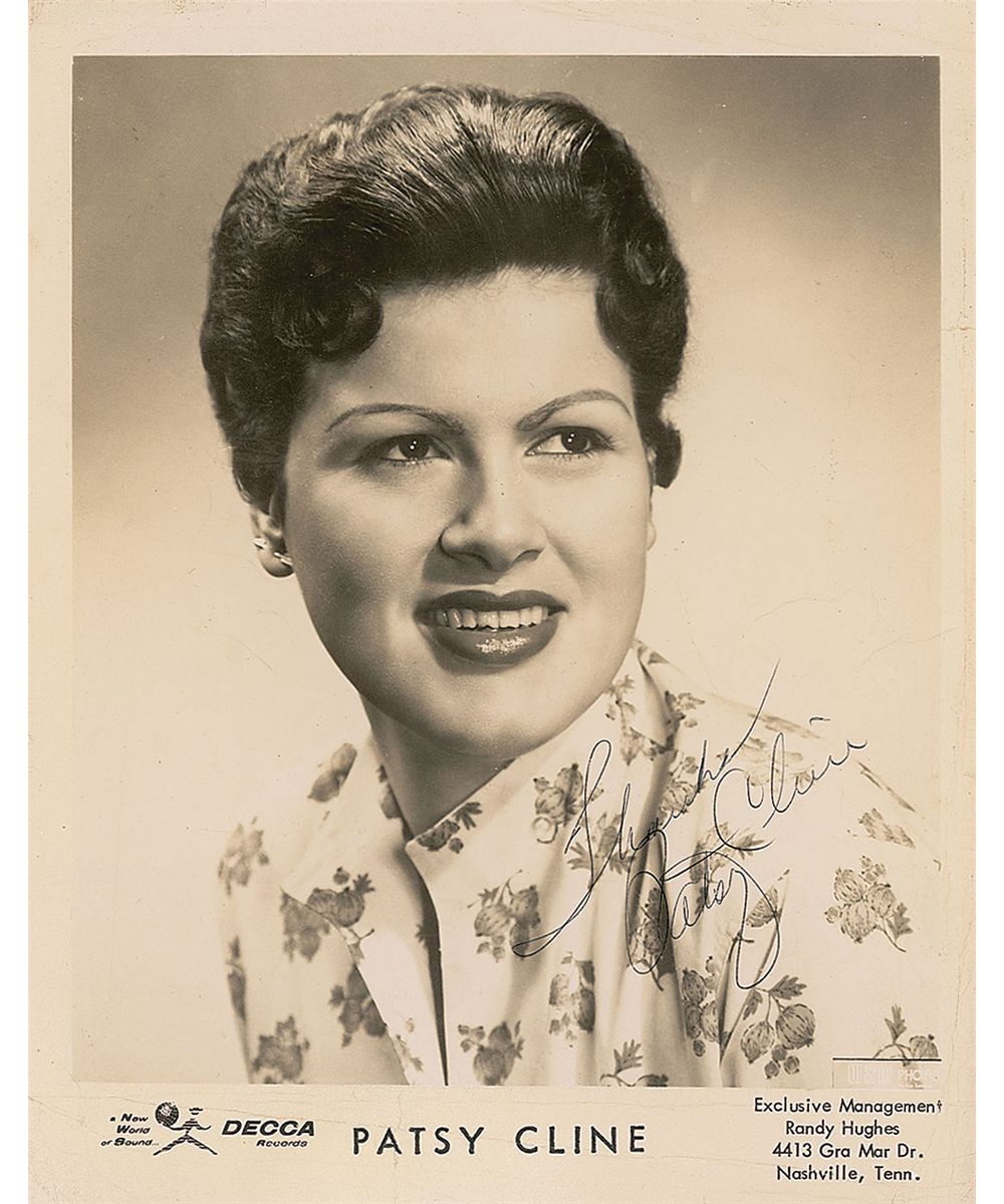 Lovely vintage glossy 8 x 10 Decca Records publicity photo of Cline in a flower-print blouse, signed in black ballpoint, “Thanks, Patsy Cline.” Photo is archivally affixed to an identical size piece of heavier cardstock. In very good condition, with scattered noticeable creases and surface impressions. Despite the flaws, the facial area is largely unaffected, and the signature remains quite clean and bold.