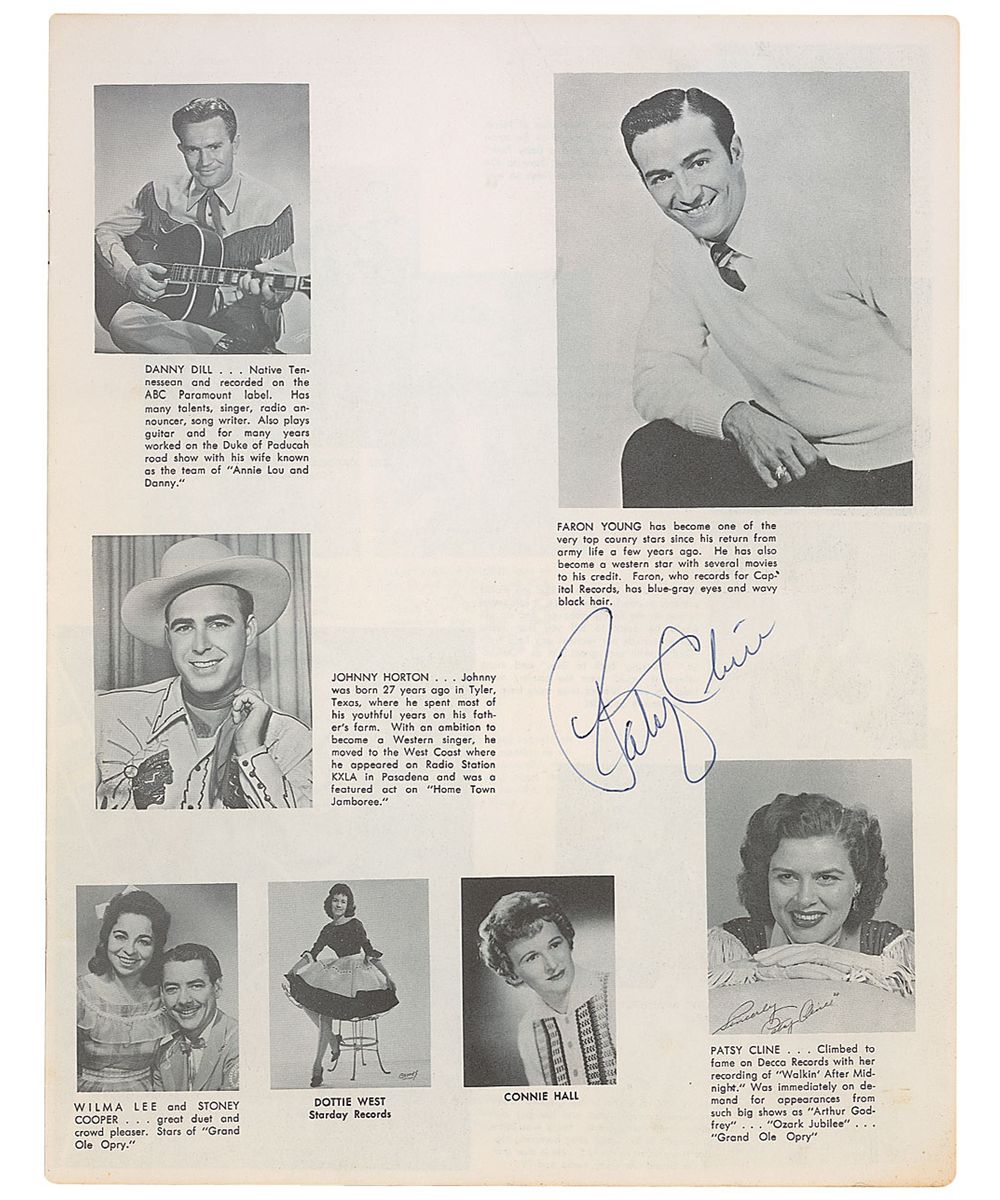 Souvenir program entitled ‘America’s Greatest Folk Singers,’ 8.25 x 10.5, circa 1956, signed inside in ballpoint by Patsy Cline, Kitty Wells, Johnnie Wright, Jack Anglin, and Bill Phillips. Central horizontal fold (not affecting Cline’s signature), otherwise fine condition. Accompanied by an unsigned WWVA Jamboree postcard and candid photo of two musicians.