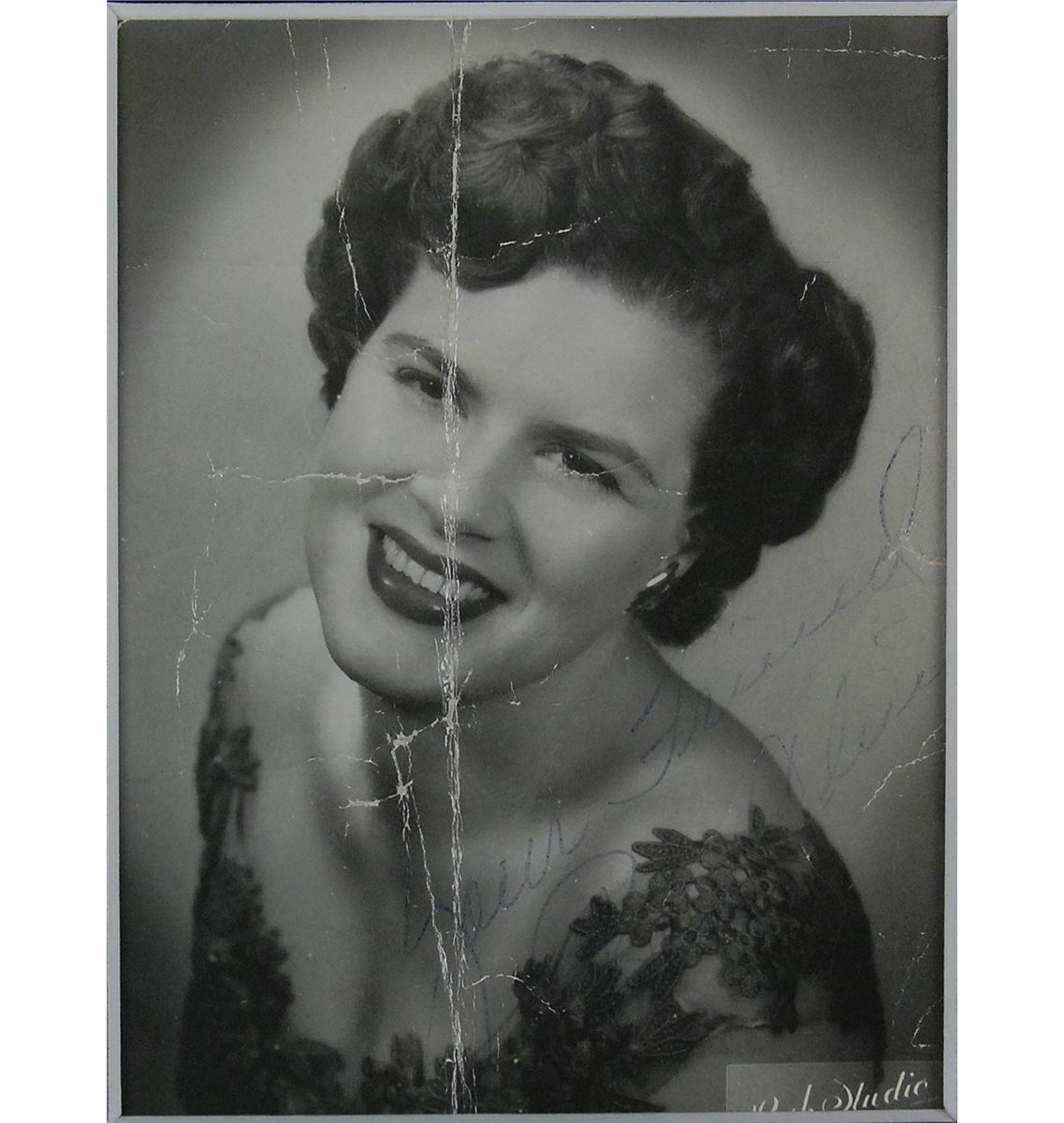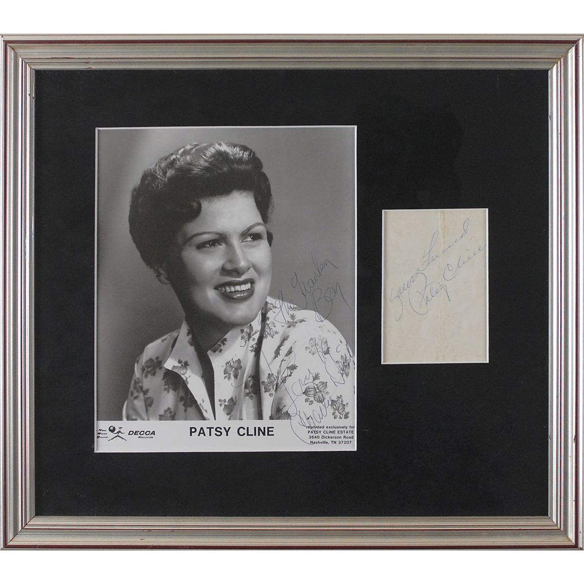 Vintage glossy 3.25 x 4.5 photo, signed in blue ballpoint, “Your friend, Patsy Cline,” and signed again on the reverse again, “Your friend, Patsy Cline.” Matted and framed, so both sides may be viewed, with a glossy 8 x 10 photo of Cline signed and inscribed in blue ballpoint by Cline’s husband, Charlie Dick, to an overall size of 16.5 x 15. A noticeable central vertical fold and scattered light toning and creasing, with heavier creases to image side, and signature on the image side very light, but still remaining mostly legible, otherwise very good condition.