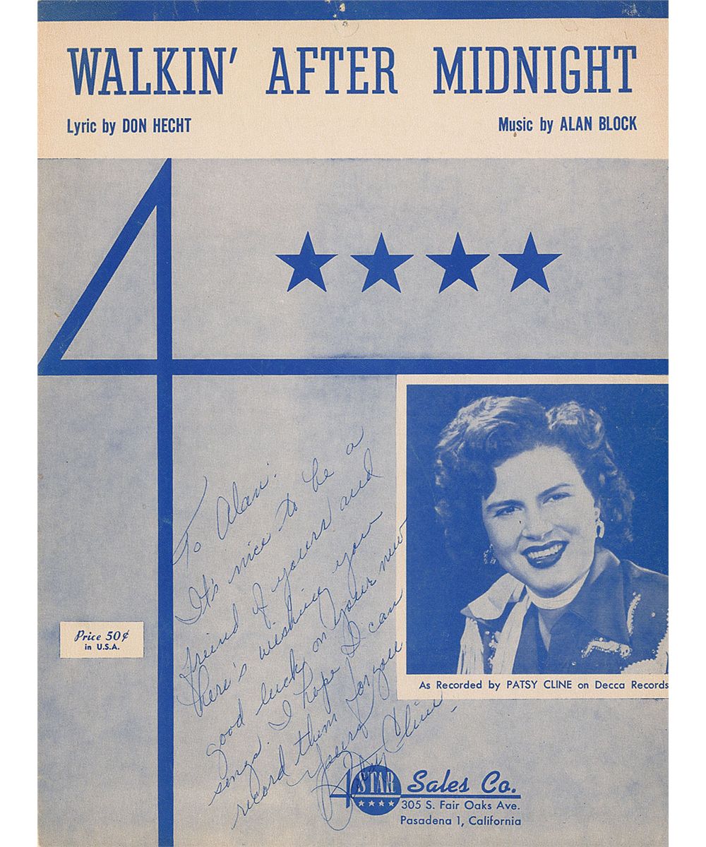 Sheet music to ‘Walkin’ After Midnight,’ 9 x 12, five pages, signed and inscribed in blue ballpoint on the front cover to the writer of the song’s music Alan Block, “To Alan: It’s nice to be a friend of yours and here’s wishing you good luck on your new songs. I hope I can record them for you. Yours, Patsy Cline.” Accompanied by a 2013 letter of provenance from the daughter of Block’s partner, which reads: “This signed sheet music has been in my possession since 1958. The song writer, Alan Block, was a partner in another small record company with my mom & he gave it to me.” In fine condition, with a couple of tack holes to top edge and a few creases. Agreeing to record the song after originally not caring for it, ‘Walkin’ After Midnight’ was released on February 11, 1957, and became her first major hit, reaching No. 2 on the Billboard country music chart. A fabulous item with incredible personal and professional association.