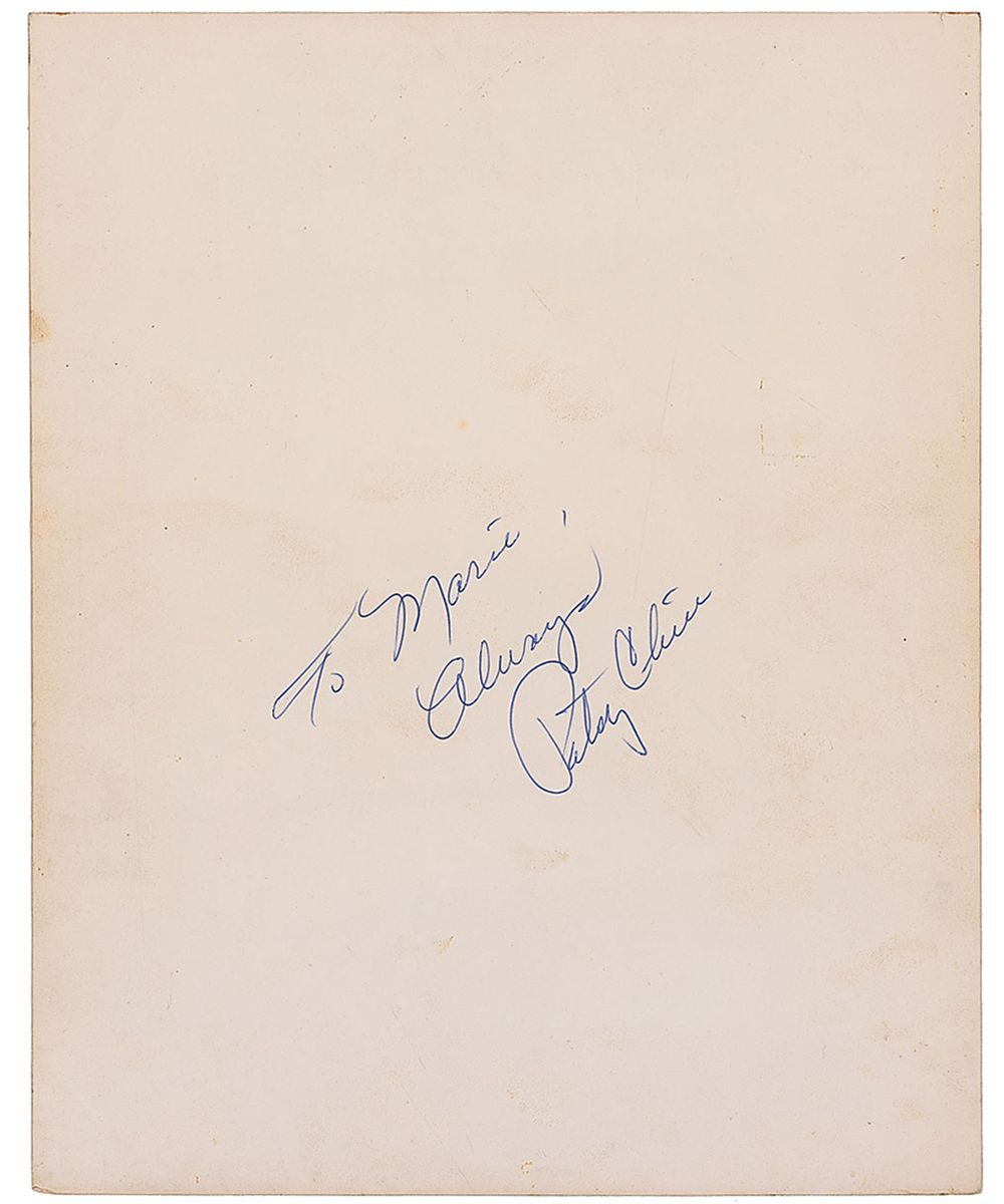 Vintage glossy 8 x 10 publicity photo by Rush Studios, signed in fountain pen, “Your friend always, Patsy Cline ‘Decca.’” Photo is also signed and inscribed on the reverse in blue ballpoint, “To Marie, Always, Patsy Cline.” Scattered light creases, old tape toning and remnants to corners, and ink notations in the lower border, otherwise fine condition.