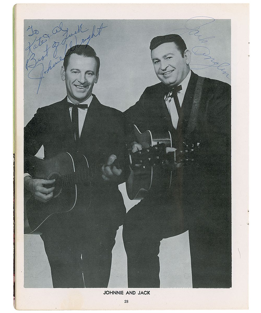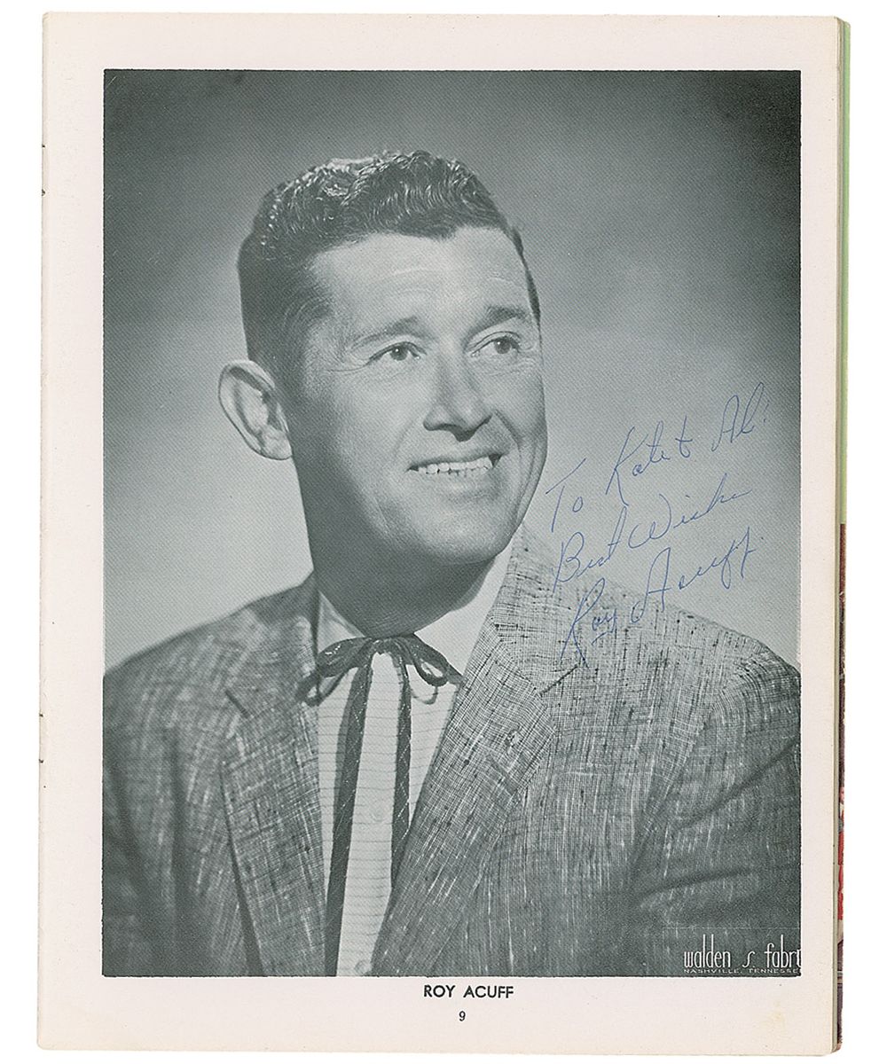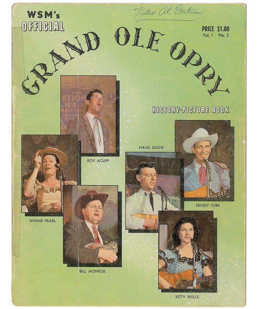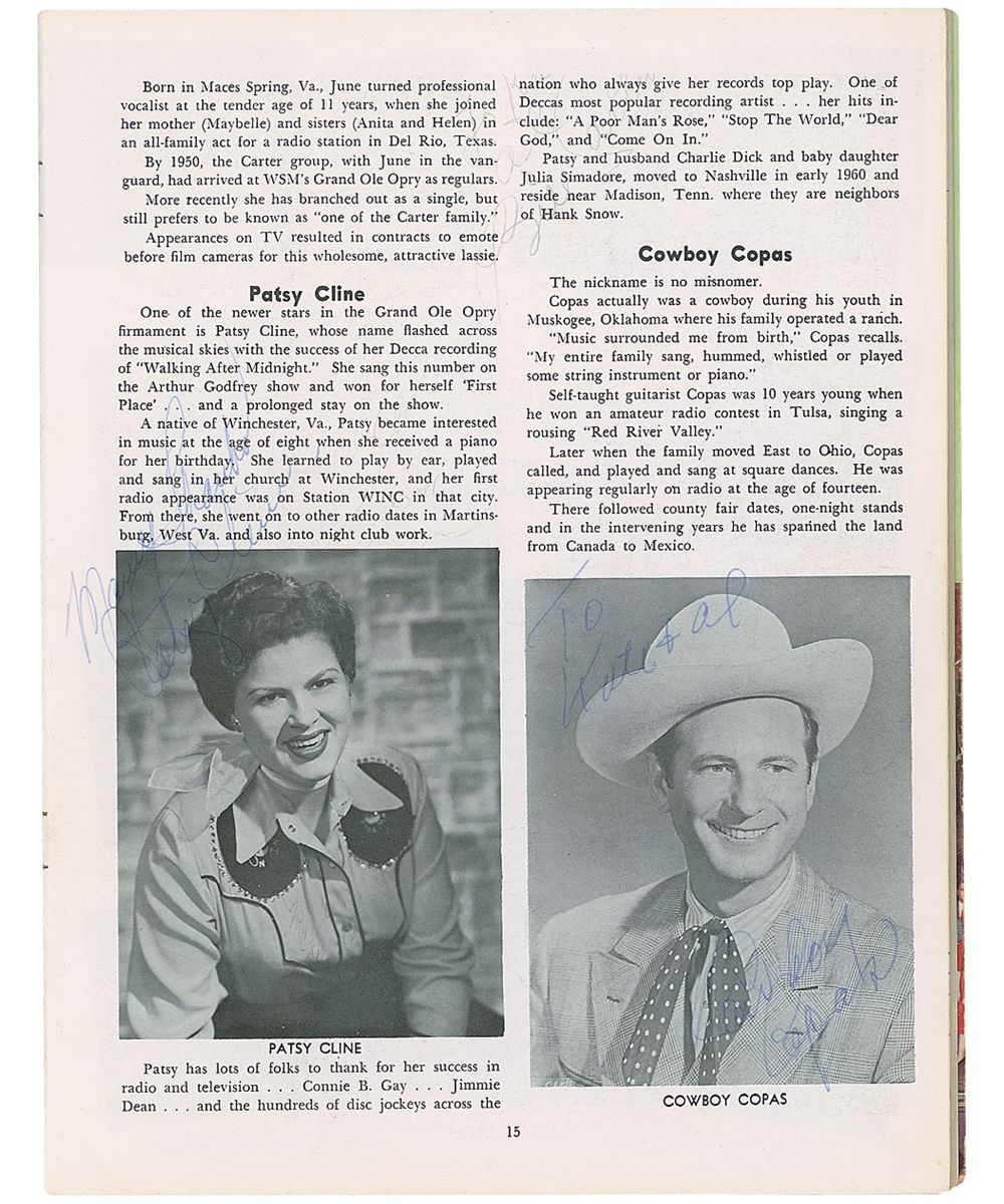 Official Grand Ole Opry program, 8.5 x 11, signed in ink inside by more than 50 country stars near their photos. Signers include: Patsy Cline (adding “Many thanks”), Roy Acuff, Chet Atkins, Margie Bowes, Carl Butler, Archie Campbell, Bill Carlisle, June Carter, Cowboy Copas, Stoney Cooper and Wilma Lee, Skeeter Davis, Earl Scruggs and Lester Flatt, Don Gibson, Tompall Glaser, Billy Grammer, Grandpa Jones, George Hamilton IV, Hawkshaw Hawkins, Ferlin Husky, Stonewall Jackson, Jack Anglin and Johnnie Wright, Cousin Jody, four members of the Jordanaires, Lonzo and Oscar, the Louvin Brothers, Bill Monroe, George Morgan, Jimmy Newman, Minnie Pearl, Ray Price, Jim Reeves, Marty Robbins, Jean Shepard, Stringbean, Hank Snow, Justin Tubb, Ernest Tubb, Porter Wagoner, Kitty Wells (signed twice with a later signature dated 1982), Billy Walker, the Wilburn Brothers, the Willis Brothers, Del Wood, Faron Young, and two others. The back page bears ten additional signatures. The majority of the signatures have been inscribed and the original owner’s name is written on the front cover. In very good condition with scuff marks and old clear tape reinforcement of the spine not affecting any of the signatures. Cline joined the cast of the Grand Ole Opry in 1960 and became one of the Opry’s biggest stars. She is believed to be the only person granted membership by asking.