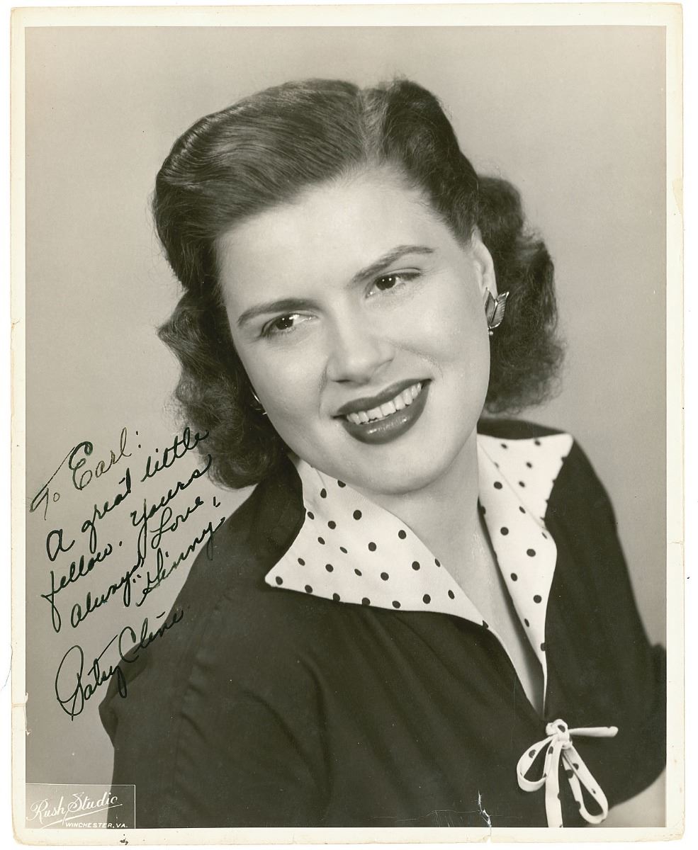 Vintage 8 x 10 Rush Studio portrait of Cline in a dark dress with a polka-dot collar, signed and inscribed in fountain pen to her cousin Earl Allanson, “To Earl: A great little fellow. Yours always, Love, ‘Ginny’ Patsy Cline.” In very good to fine condition, with a few small edge tears. Accompanied by the original transmittal envelope.