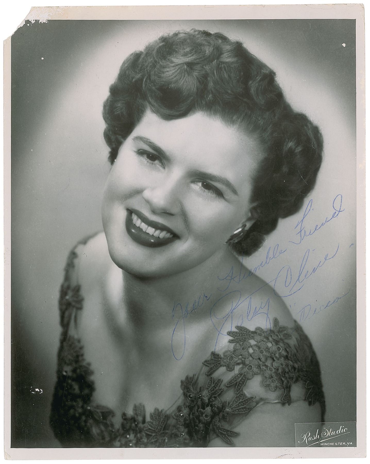 Vintage glossy 8 x 10 portrait of the country star by Rush Studio, signed in blue ballpoint, "Your Humble Friend, Patsy Cline, 'Decca.'" A typed collector's notation on the reverse indicates that it was signed in 1958. In very good condition, with a missing upper left corner, overall light creasing, surface impressions from typed notations on the reverse, and a few small flecks of emulsion loss.
