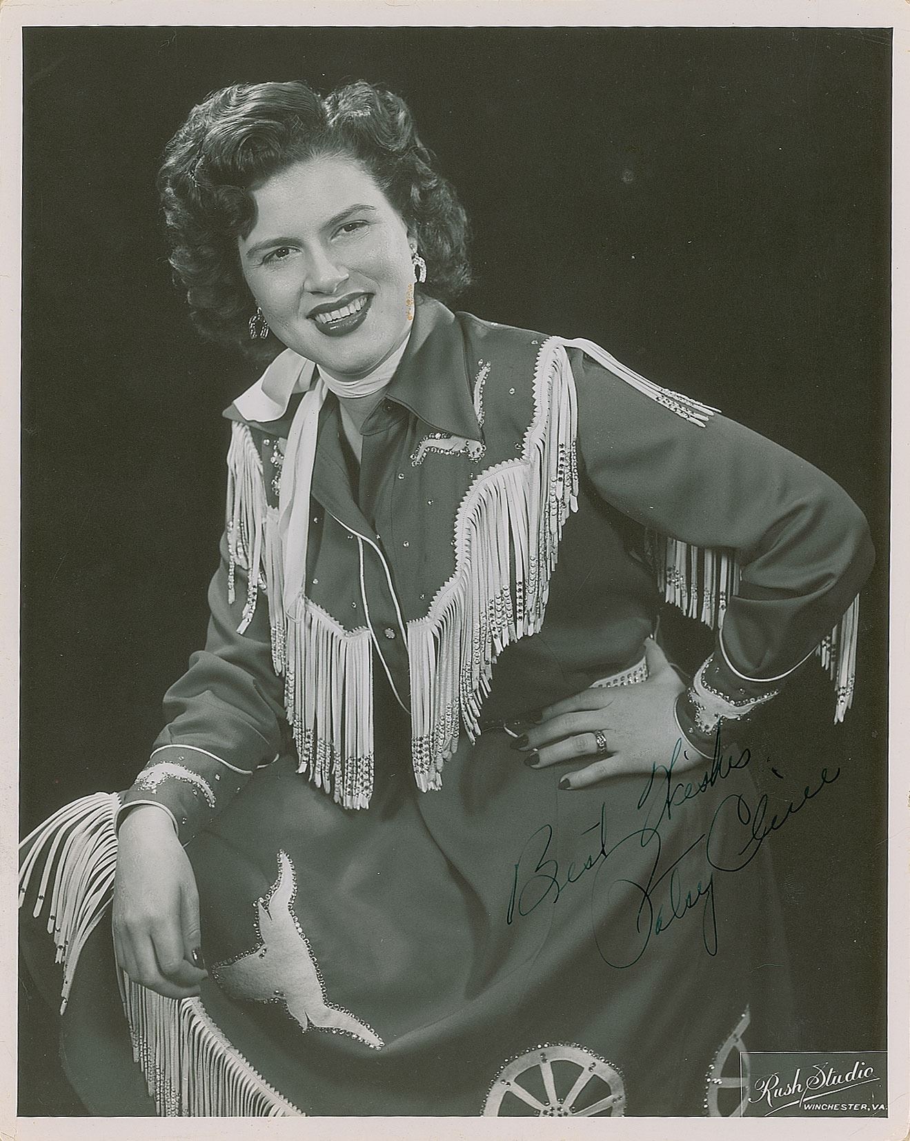 Gorgeous vintage glossy 8 x 10 Rush Studio photo of the country star decked out in Western costume, signed in fountain pen, "Best Wishes, Patsy Cline." In fine condition.