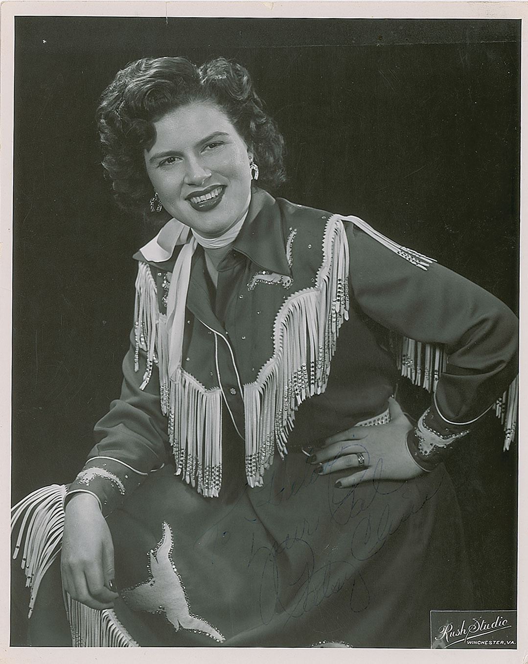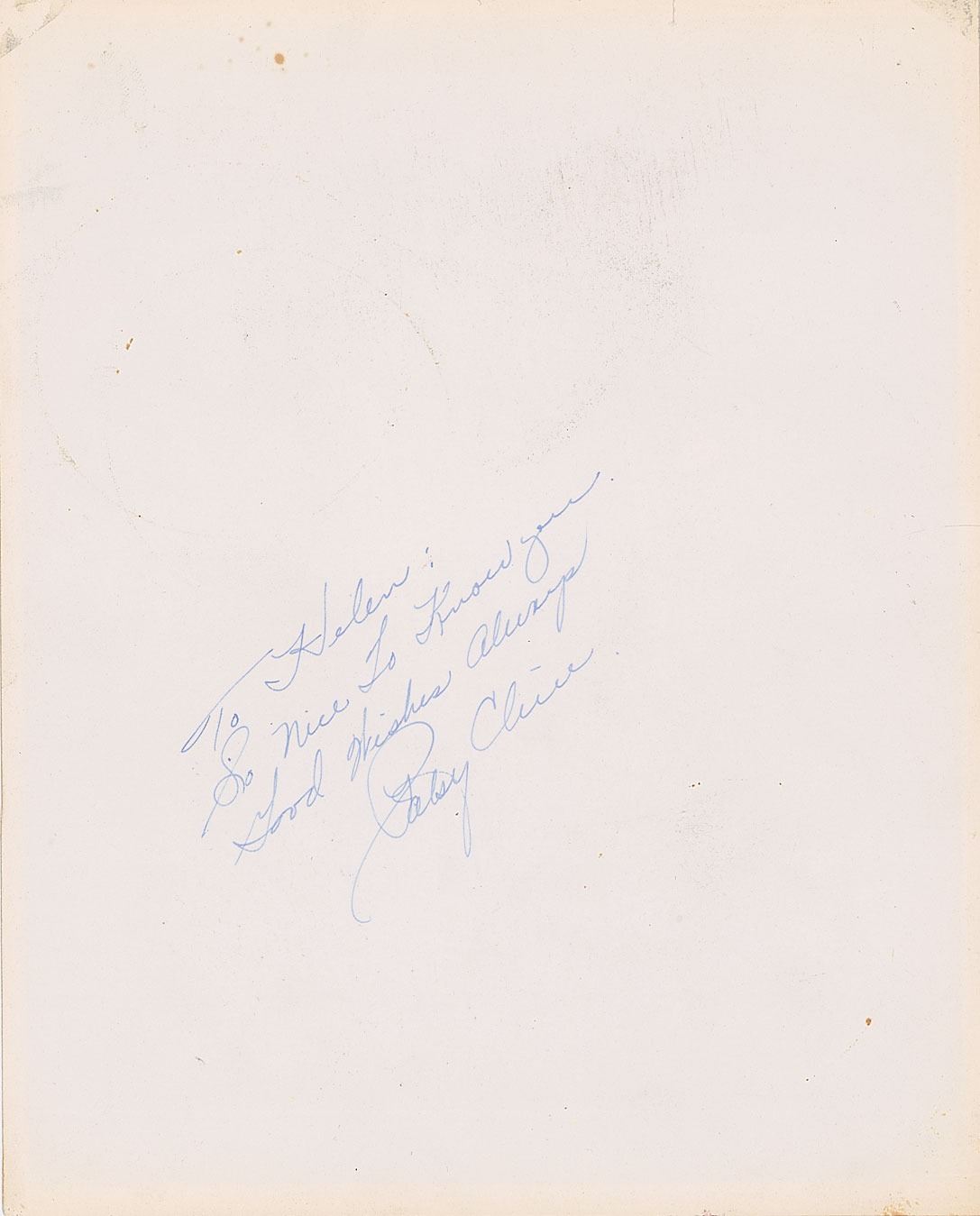 Twice-signed vintage glossy 8 x 10 photo of the tragic country star by the Rush Studio of Winchester, Virginia, signed and inscribed in blue ink, "To Helen, Your Pal, Patsy Cline," who also signs and inscribes on the reverse, "To Helen: So nice to know you. Good wishes always, Patsy Cline." In very good to fine condition, with poor contrast to the signature on the front, and some wear to edges, including two small tears to top edge.