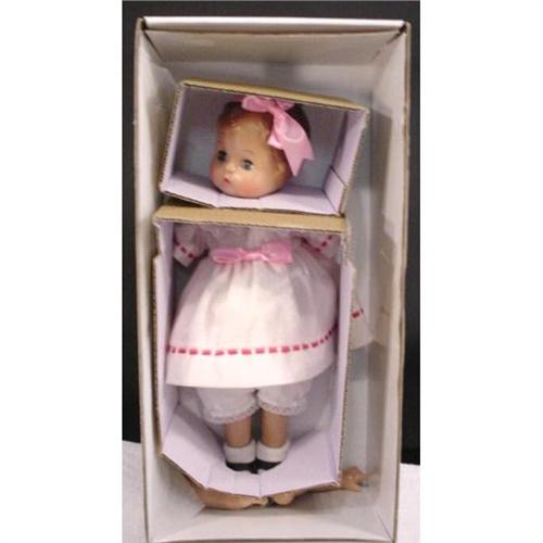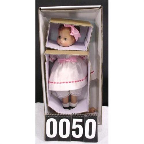 The Effanbee Doll Co began nearly 100 years ago, but this doll is a bit of a mystery to us. The box suggests "Patsy Joan" as having been made in China in 1994, it was purchased by the original owner in 1996, but appears to be old; it's probably a reproduction of a doll originally produced in 1910. The doll's arms are loose (the rubber band has deteriorated, which doesn't reduce its value), but has its orig. box and packing and is otherwise in beautiful condition!