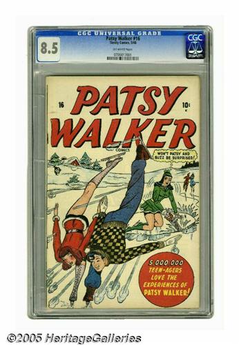 <B>Patsy Walker #16 (Atlas, 1948) CGC VF+ 8.5 Off-white pages.</B></I> This is the only copy of this issue that CGC has certified as of this writing. Overstreet 2005 VF 8.0 value = $81; VF/NM 9.0 value = $113. CGC census 6/05: 1 in 8.5, none higher.