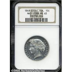 <B>Pattern 10 Centimes 1848,</B></I> Mazard-1338a White metal MS63 NGC. <BR><BR><B>Important notice:</B> Heritage usually auctions material at the rate of 200-250 lots per hour. On some occasions eBay Live bid software or the Internet may not be able to keep up with the pace of the auction. We recommend placing a realistic absentee bid now as insurance to avoid disappointment. Occasionally the auctioneer may eliminate or reject an eBay Live bid, and the auctioneer may also reopen a lot after the close of the eBay live bidding (usually because we missed an audience bid), and may reject your bid even if it shows you as the winning bidder. By bidding via eBay Live, you agree that Heritage may award the lot to another bidder at its sole discretion under the circumstances described above or any other reasonable circumstances. Since eBay bids are not shown to us until we open the lot on the floor, we treat those bids just like floor bids. In most cases the floor responds before the eBay bid is presented to us, due to Internet lag time, so for consistency we have made it a policy that floor bids are always considered first over tie eBay live bids. Also please note that all Heritage lots purchased through eBay Live carry a 20% Buyer's Premium. Please make sure you read the Terms and Conditions before you bid.