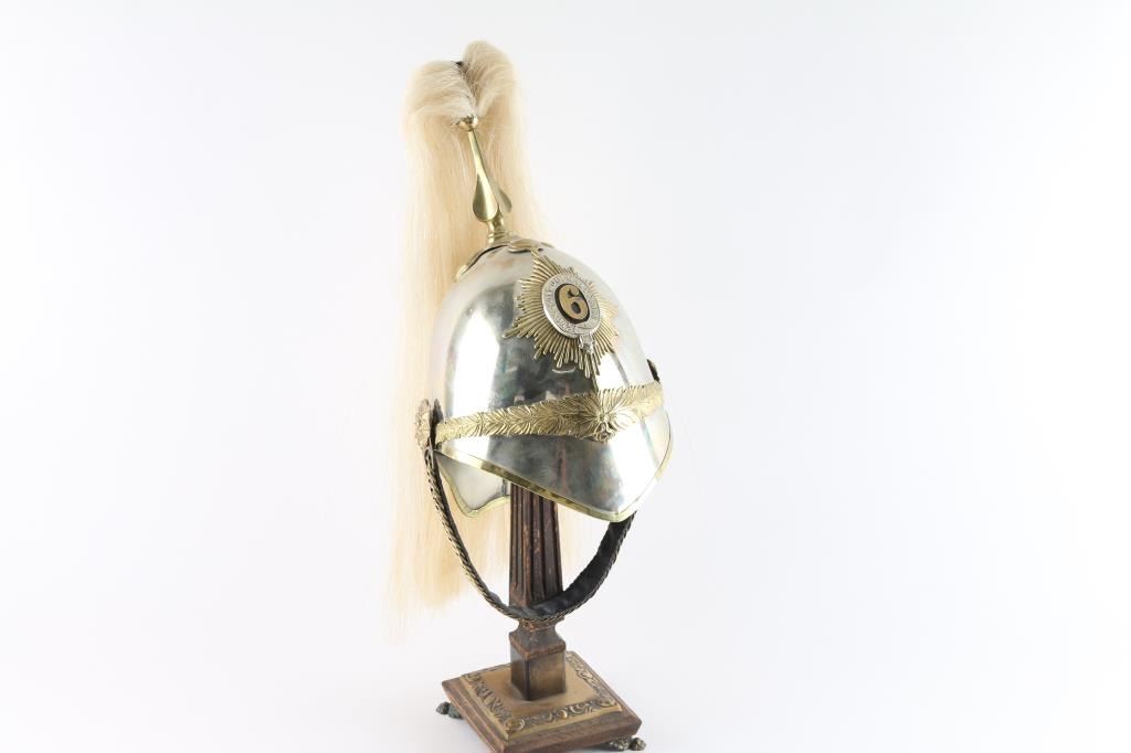 Vintage troopers pattern 1871 metal dress helmet for the 6th Dragoon Guards. The helmet has the original brass starburst helmet plate to the center with separate brass 6 numeral to the center. silver tone ring around the six has the regimental motto "Honi. Soit, Qui, Mal. Y. Pense." Anglo-Norman language, a dialect of Old Norman French spoken by the medieval ruling class in England, meaning "shamed be whoever thinks ill of it", usually translated as "shame on anyone who thinks evil of it". It is the motto of the British chivalric Order of the Garter, the highest of all British knight hoods, except in Scotland. Horse hair plume. Metal Tudor rose side boss fittings which supports the leather lined brass scaled chinstrap. Small Tudor rose on top of plume. The white horse hair plume remains in clean condition with the original brass top fitting. Original brown leather liner is very good. Overall this is a excellent example of a metal dragoon troopers helmet. Comes on an ornate wooden stand. From the Joe Musso Collection.