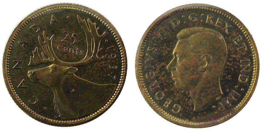 Pattern 1937 25¢ CH# DC-22 ICCS SP65. Brass patern struck on a thick plain edge flan at the Paris Mint, a superb example of this classic rarity with original light toning and some minor spotting.