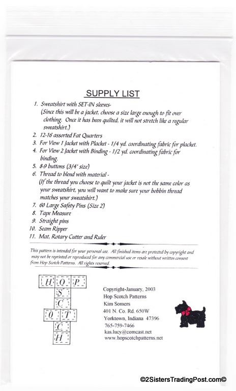 Pattern is for an 'All - Occasion Sweatshirt' by Kim Somers for Hop Scotch Patterns. The pattern is for a button up sweatshirt with set-in sleeves.