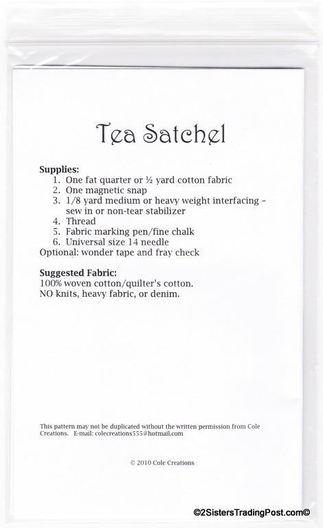 Pattern for a 'Tea Satchel' form Cole Creations 2010. The pattern includes instructions to make a six pocket tea wallet with a magnetic snap closure.