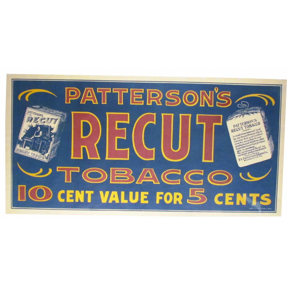 Patterson's Recut Tobacco Paper Banner. Vertical crease in center otherwise near excellent condition. 36 X 17 3/4 inches.