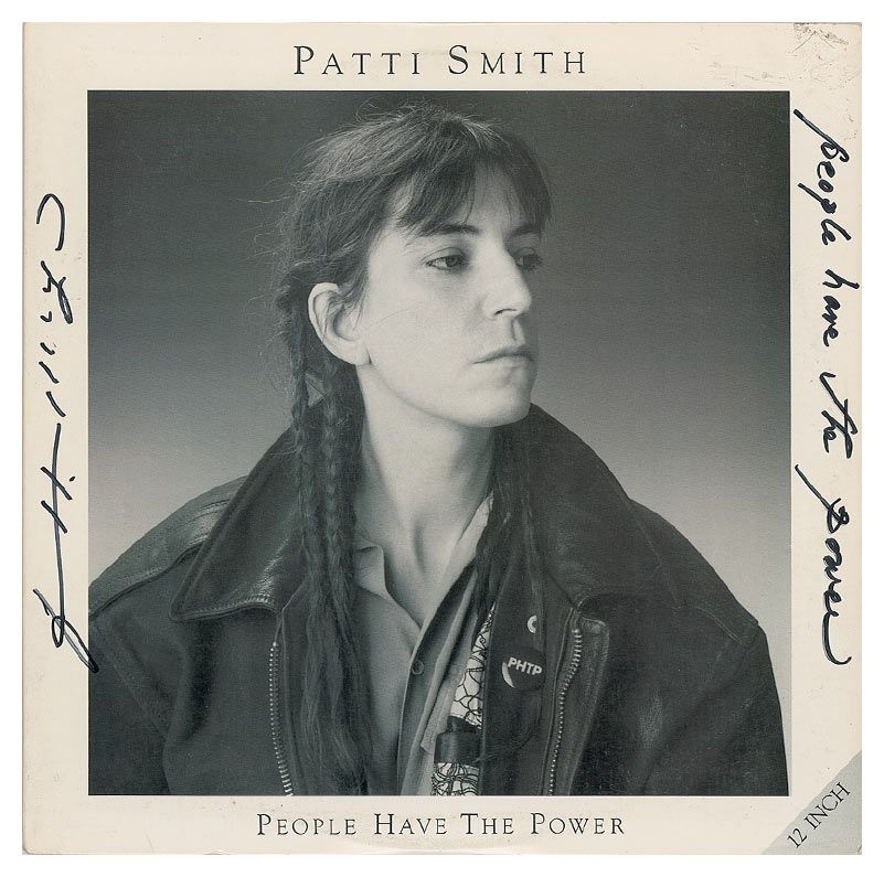 People Have the Power album signed vertically on the front in black felt tip, adding “People Have the Power.” In fine condition, with some light surface wear and an adhesive remnant to the top right corner. The record is included. Accompanied by a photo taken at the time of signing.