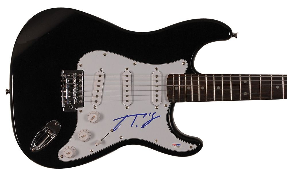 Black-bodied Stedman Pro ‘stratocaster-style’ electric guitar, signed upside down on the white pickguard in blue felt tip. In fine condition, with a PSA/DNA authentication label affixed to pickguard. Accompanied by a certificate of authenticity from PSA/DNA. Oversized.