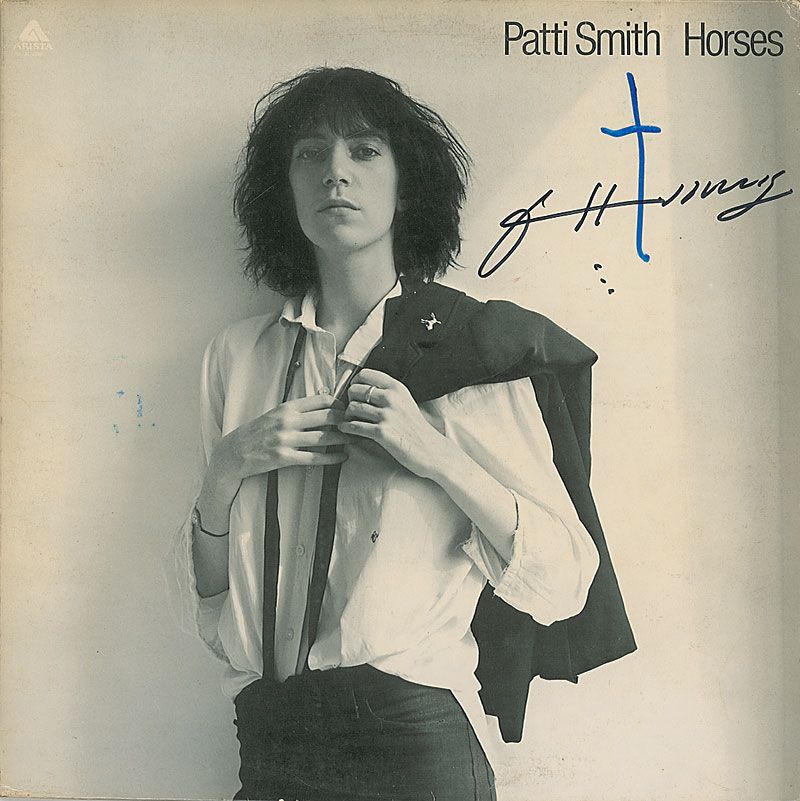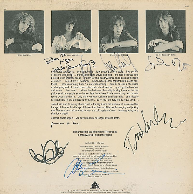 Horses album signed on the front and back covers in felt tip by Patti Smith, John Cale, Allen Lanier, Tom Valerie, Lenny Kaye, Ivan Kral, and Jay Dee Daugherty. In fine condition. The record is included. Accompanied by a full letter of authenticity from Roger Epperson/REAL.
