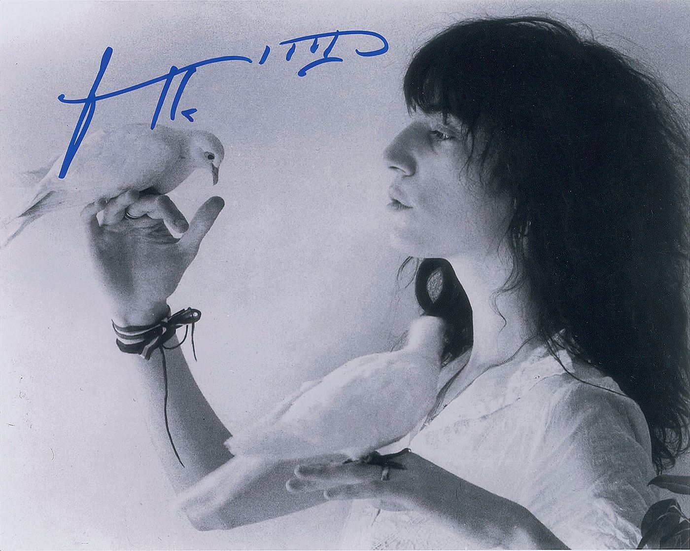 Satin-finish 10 x 8 photo of Smith holding a pair of doves, signed in blue felt tip. In very fine condition. Consignor notes that the signature was obtained at Cleveland Westin Hotel prior to the Rock and Roll Hall of Fame induction ceremony in 2015.
