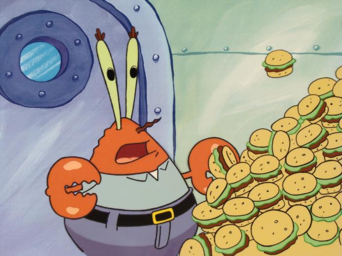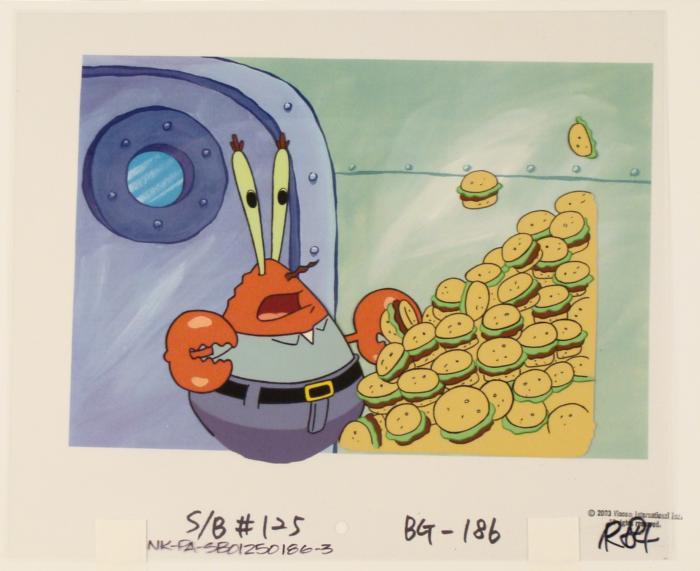 To create production cels, the original animator's drawing is transferred onto an acetate cel (by hand-inking and/or photo copying). The cel is then hand-painted on the reverse side. The background accompanying this set-up is a hand-painted original production background. The printed background is ready to be matted and framed. It is a colored background with a cel and has the animator's notations at the bottom of the background and the cel. The background is a printed reproduction background. The cel has multiple layers; first are the Krabby Patties and the second cel is Mr. Krabs