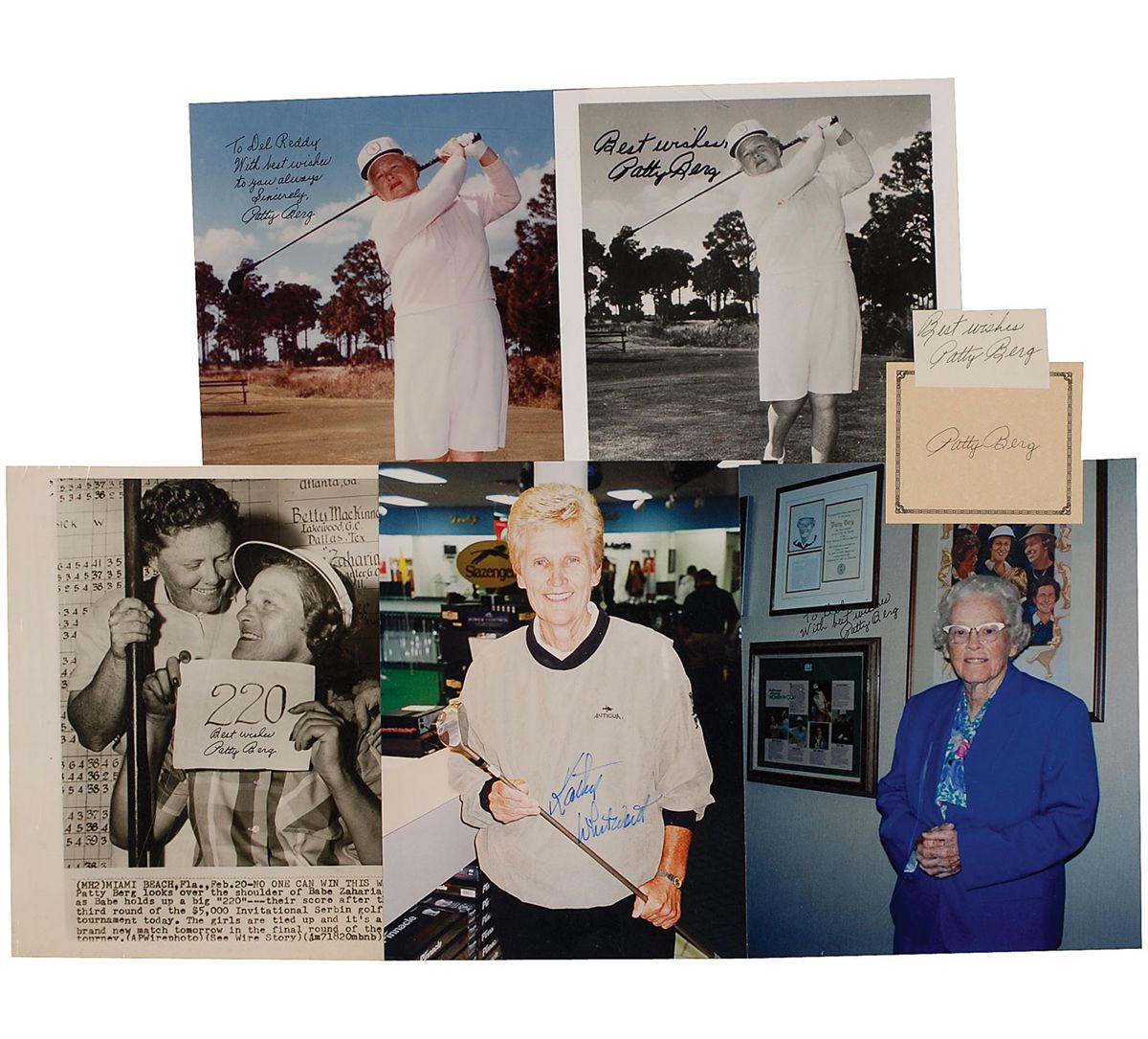 Berg is a charter member of World Golf Hall of Fame and Whitworth holds a place in golf with the all-time most tournament wins ever for both men or women. Four glossy 8 x 10 photos of Patty Berg, each signed in felt tip or ink, two inscribed; a 4 x 3 bookplate signed in black ink by Berg; an ink signature, “Best wishes, Patty Berg,” on a 2.75 x 1.5 card; and a color satin-finish 8 x 10 photo of Kathy Whitworth, signed in blue felt tip. Scattered creases and edge tears to one of Berg’s photos, otherwise fine condition.