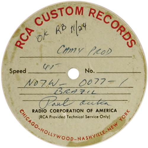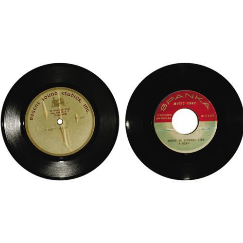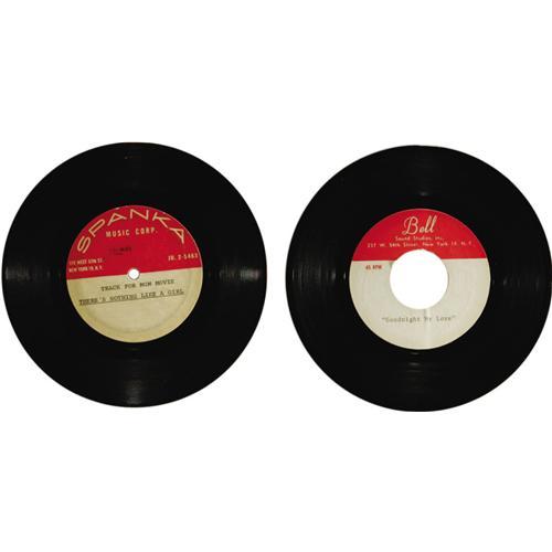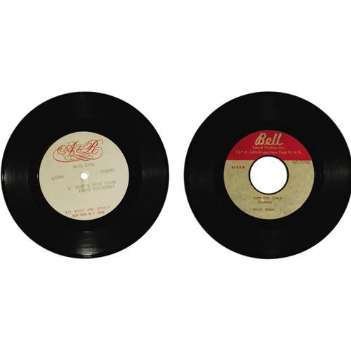 <B>Paul Anka Acetate Group of 15.</B></I> Here are 15 acetates of mostly unreleased singles from one of the most celebrated singer-songwriters of the early Rock 'n' Roll era. Included are 11 7" acetates: "Brazil" (RCA No7W 0077) in VG 5; "Goodnight My Love" (Bell) in VG-EX 6; "Heading Home" Mono (A&R) in VG 5; "Hello Again (tk 4)"/ "Hello Again (tk 5)" (Bell, 1964) in VG-EX 6; "I Know I'm Losing You" (instrumental rhythm track" - Bell/ Spanka Music, 1968) in VG-EX 6; "Leo's Bull" (instrumental - Regent, 1960s) in VG 5; "Montego Bay" (instrumental - Bell) in VG-EX 6; "Summers Gone" (sung in German -Bell, 1960s) in VG-EX 6; two copies of "There's Nothing Like A Girl" (instrumental track - Spanka Music) in VG-EX 6 and VG 5; and "What's This Thing About Christmas" (A&R) in VG-EX 6. <BR><BR>Three 8" acetates include "Can't Get Along"/ "Poor World" (backing track without vocals, marked "Italy Album" on Spanka) in VG 5, except skips near beginning of track; and two unidentified backing tracks in Italian (Audiodisc), one in VG-EX 6 and one in VG 5 with three skips. <BR><BR>The final 10" acetate features Anka and Rita Pavone, "Sonny Boy"/ "Kiddy, Kiddy Kiss Me", is in German (with some English), and grades in EX 7. <I>From the GRT Collection.</B></I><BR><BR><b>Shipping:</b> Recordings (<a target="_blank" href="http://www.heritageauctions.com/common/shipping.php">view shipping information</a>) <BR><BR><B>Important notice:</