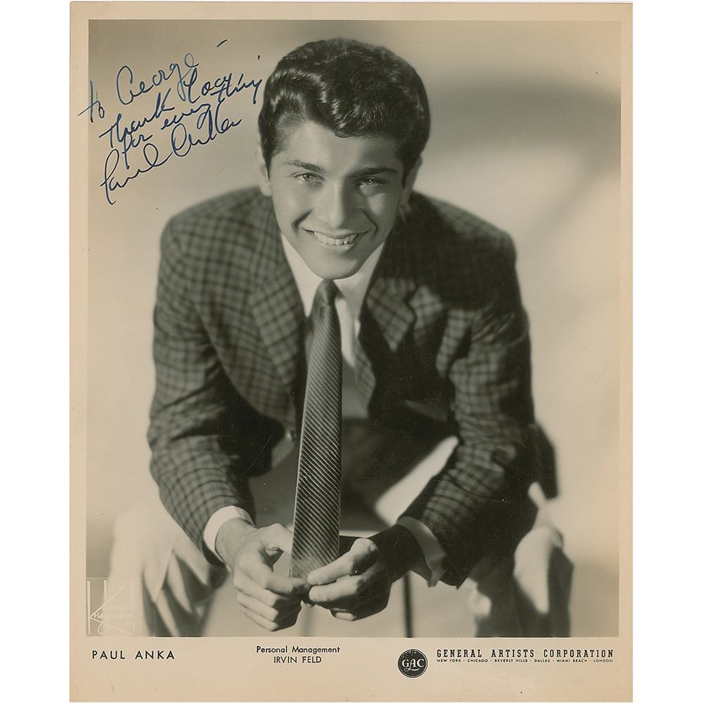 Vintage glossy 8 x 10 General Artists Corporation publicity photo of the young Anka, signed and inscribed in fountain pen, "To George—Thank you for everything, Paul Anka.” In fine condition.