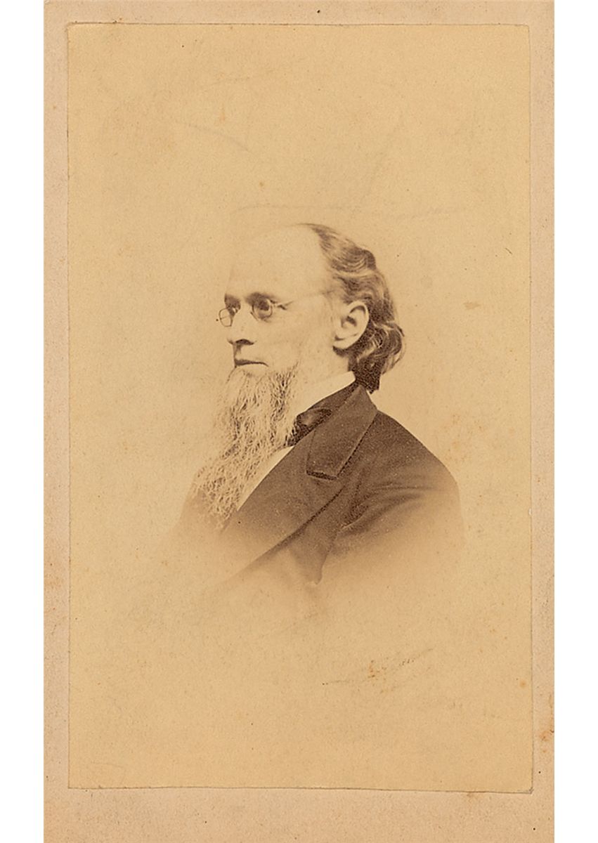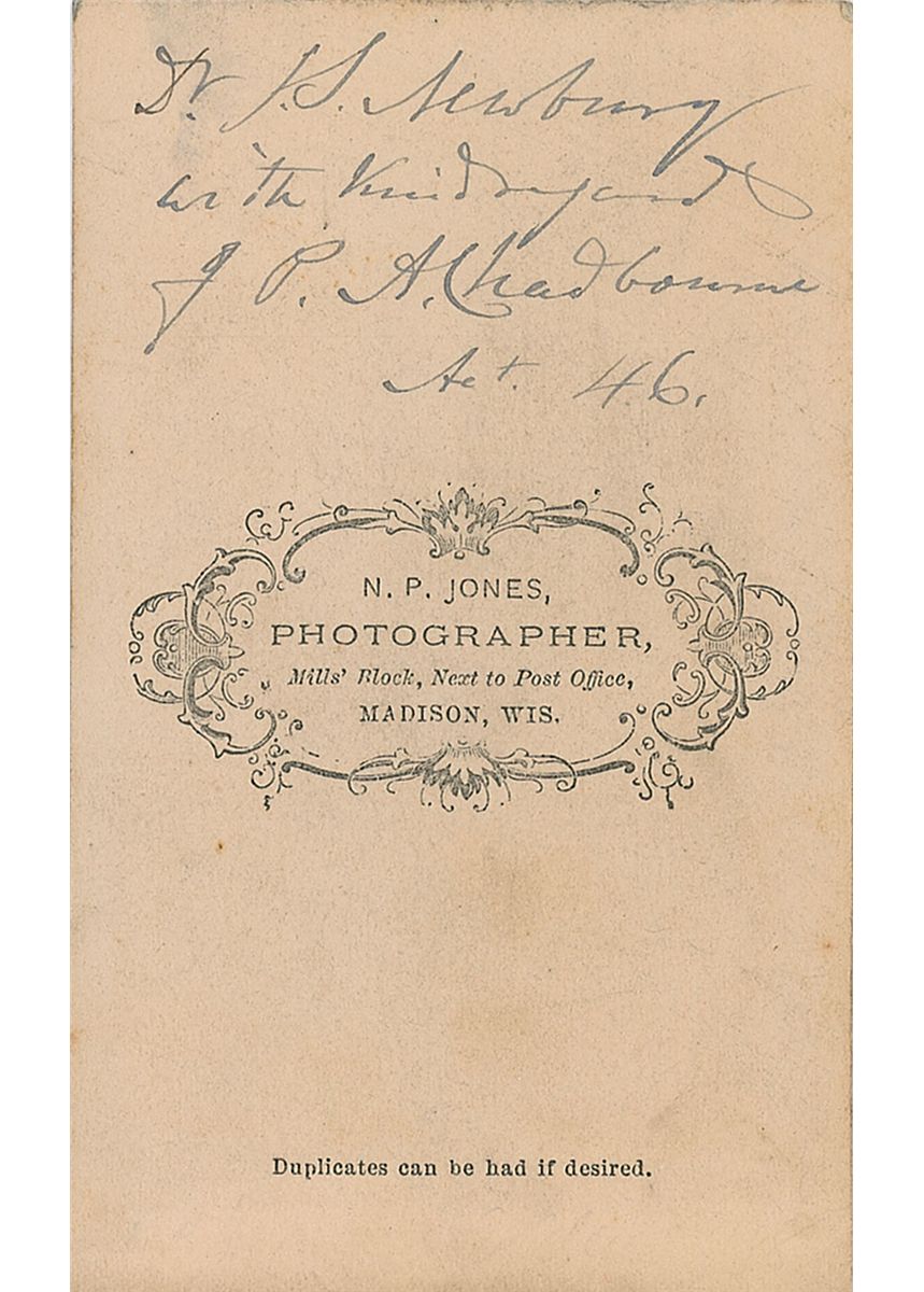 American educator and naturalist (1823–1883) who served as president of University of Wisconsin from 1867 to 1870, and president of Williams College from 1872 to 1881. Original 2.25 x 4 carte-de-visite bust portrait of Chadborne seated by N. P. Jones of Madison Wisconsin, signed and inscribed on the reverse in black ink, “Dr. J. S. Newbury [sic], with kind regards of P. A. Chadbourne, Act. 4. 6.” In very good condition, with scattered surface marks and soiling, and slight rippling to top edge.
