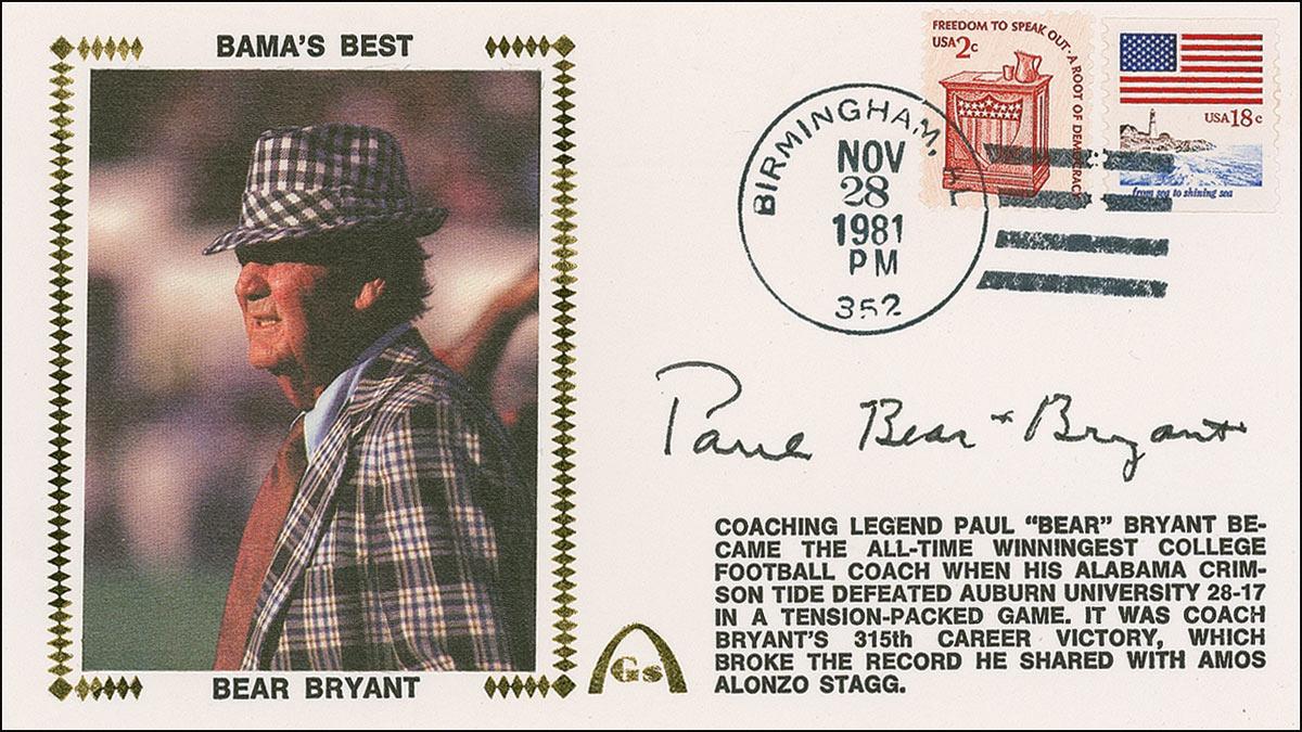 Gateway commemorative cover bearing a color silk cachet of Bryant, signed on the front in black felt tip, “Paul ‘Bear’ Bryant.” In very fine condition.