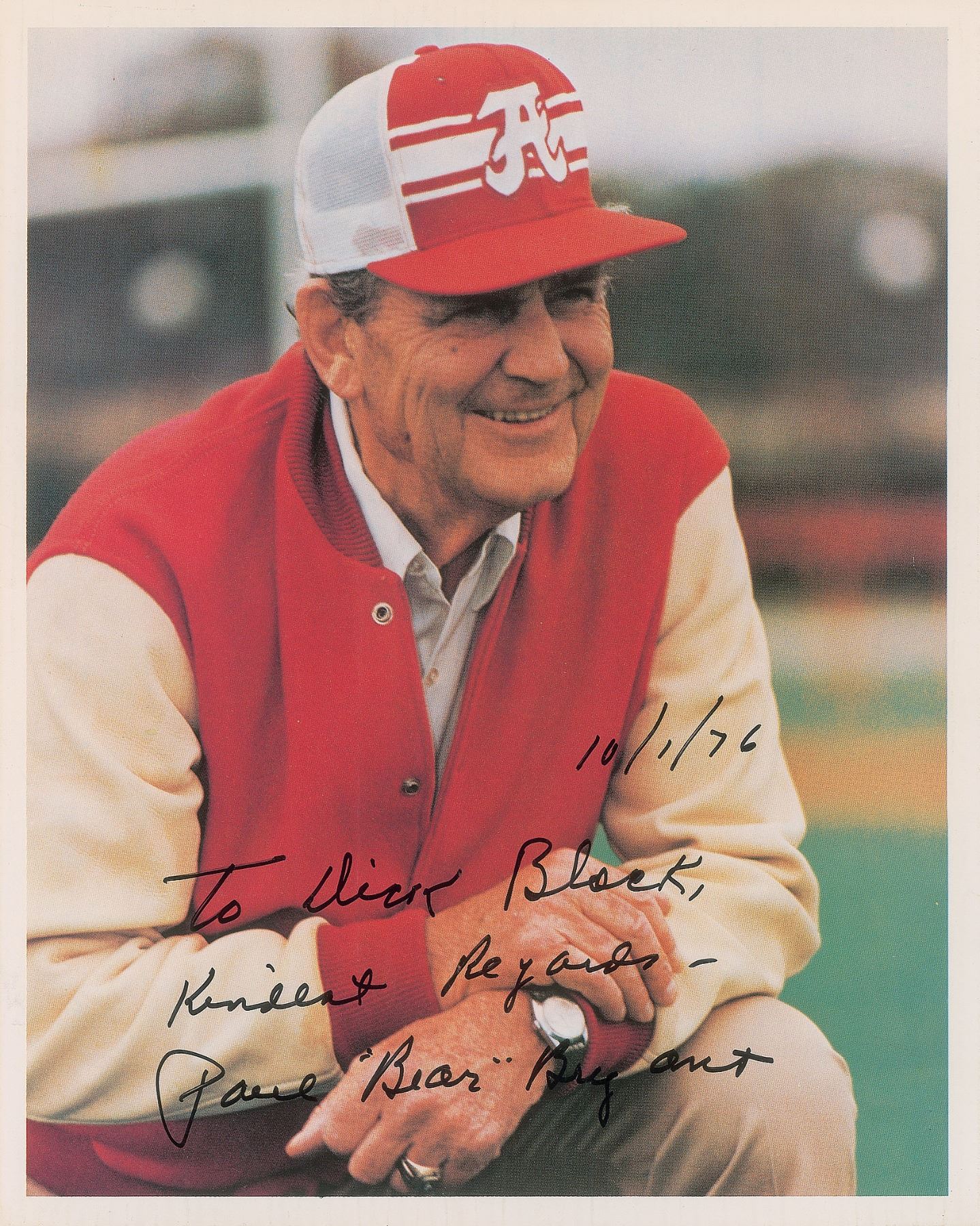 Color glossy 8 x 10 photo of Coach Bryant taking a knee in his Alabama Crimson Tide cap and varsity jacket, signed and inscribed in black felt tip, "To Dick Block, Kindest Regards‚ Paul 'Bear' Bryant," who adds the date above, "10/1/76.” In very good to fine condition, with multiple full-length vertical ripples. Accompanied by a full letter of authenticity from JSA.