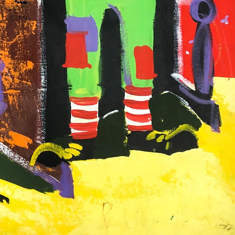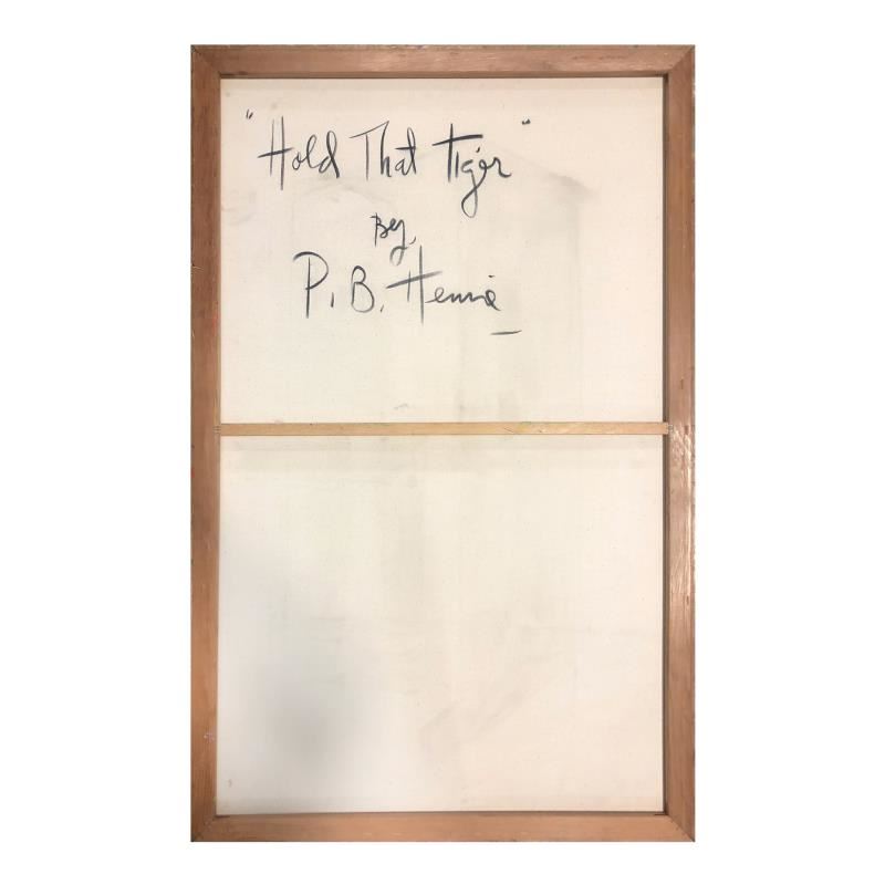 "Hold That Tiger" is an original oil painting on stretched canvas by Paul Blaine Henrie (1932-1999). The piece is hand signed by the artist and comes with a letter of authenticity. Please note that due to the age of this piece and the way it was stored, there are minor sings of wear, particularly on the corners and edges. Measures approximately. 48" x 30" (image).