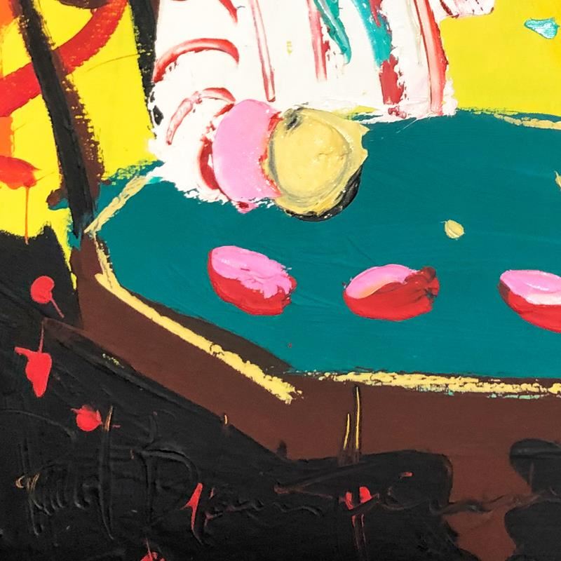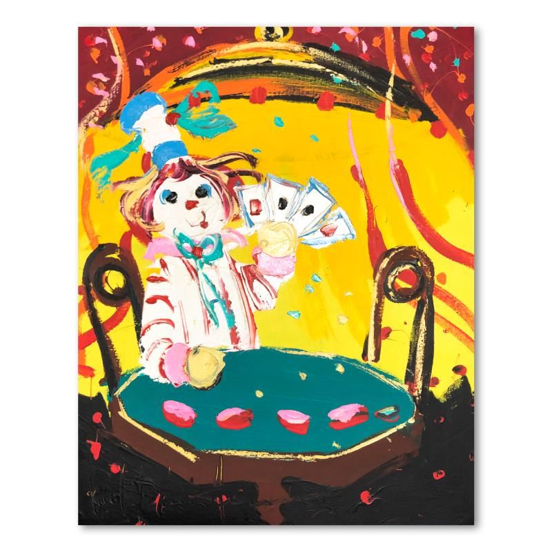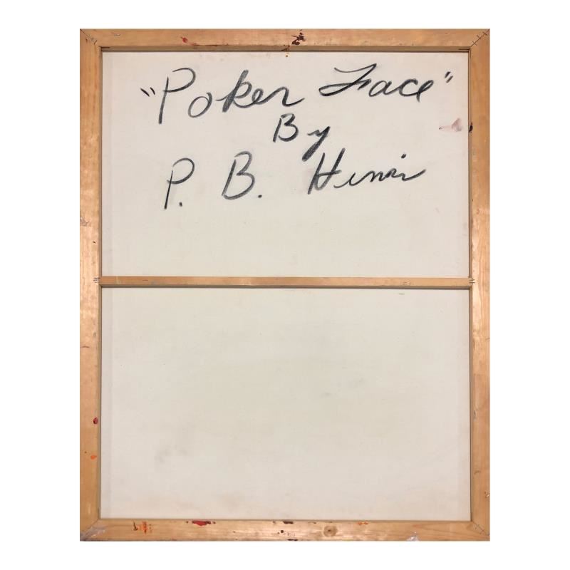 "Poker Face" is an original oil painting on stretched canvas by Paul Blaine Henrie (1932-1999). The piece is hand signed by the artist and comes with a letter of authenticity. Please note that due to the age of this piece and the way it was stored, there are minor sings of wear, particularly on the corners and edges. Measures approximately. 40" x 30" (image).