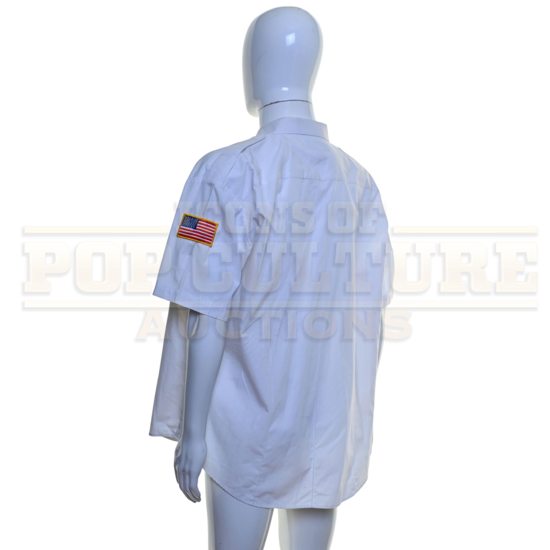 The shirt is manufactured by Tact Squad (Size 2XL) and features two button-flap chest pockets, epaulets, and production-applied patches. Most notably, the right sleeve bears the custom-made “West Orange Pavilion Mall Security Guard”patch, created specifically for the film to represent Blart’s beloved place of duty. An American flag patch is applied to the left sleeve, completing the classic mall cop silhouette.