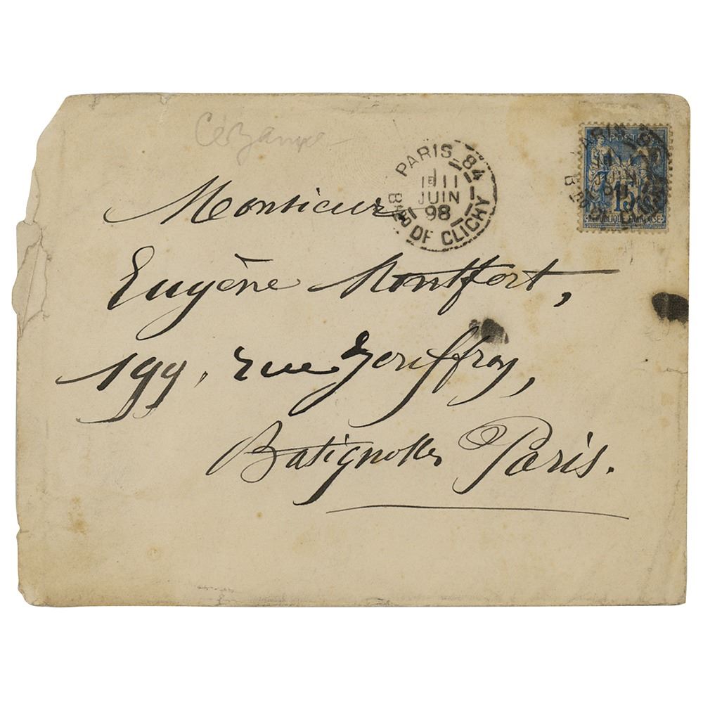 Rare ALS in French, signed “Paul Cezanne,” one page both sides, 5.25 x 8.5, June 11, 1898. Handwritten letter to the young poet and art critic Eugene Montfort, in part (translated): "I am in possession of the literary work that you kindly sent to me through Joachim Gasquet. I will have the greatest pleasure in perusing it and when the opportunity arises, you will kindly allow me to speak with you about the things of Art which interest us so much." In fine condition, with a short split to the top of the hinge. Accompanied by the original mailing envelope, addressed in Cezanne's hand.
