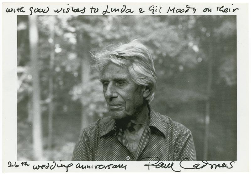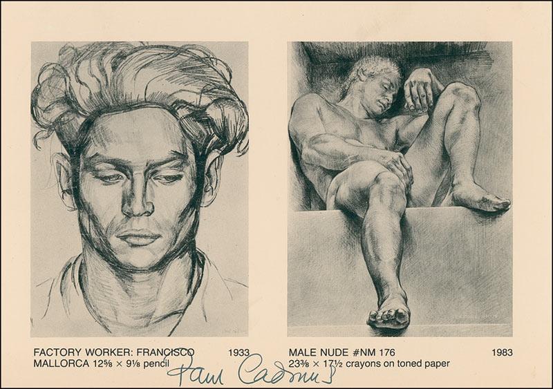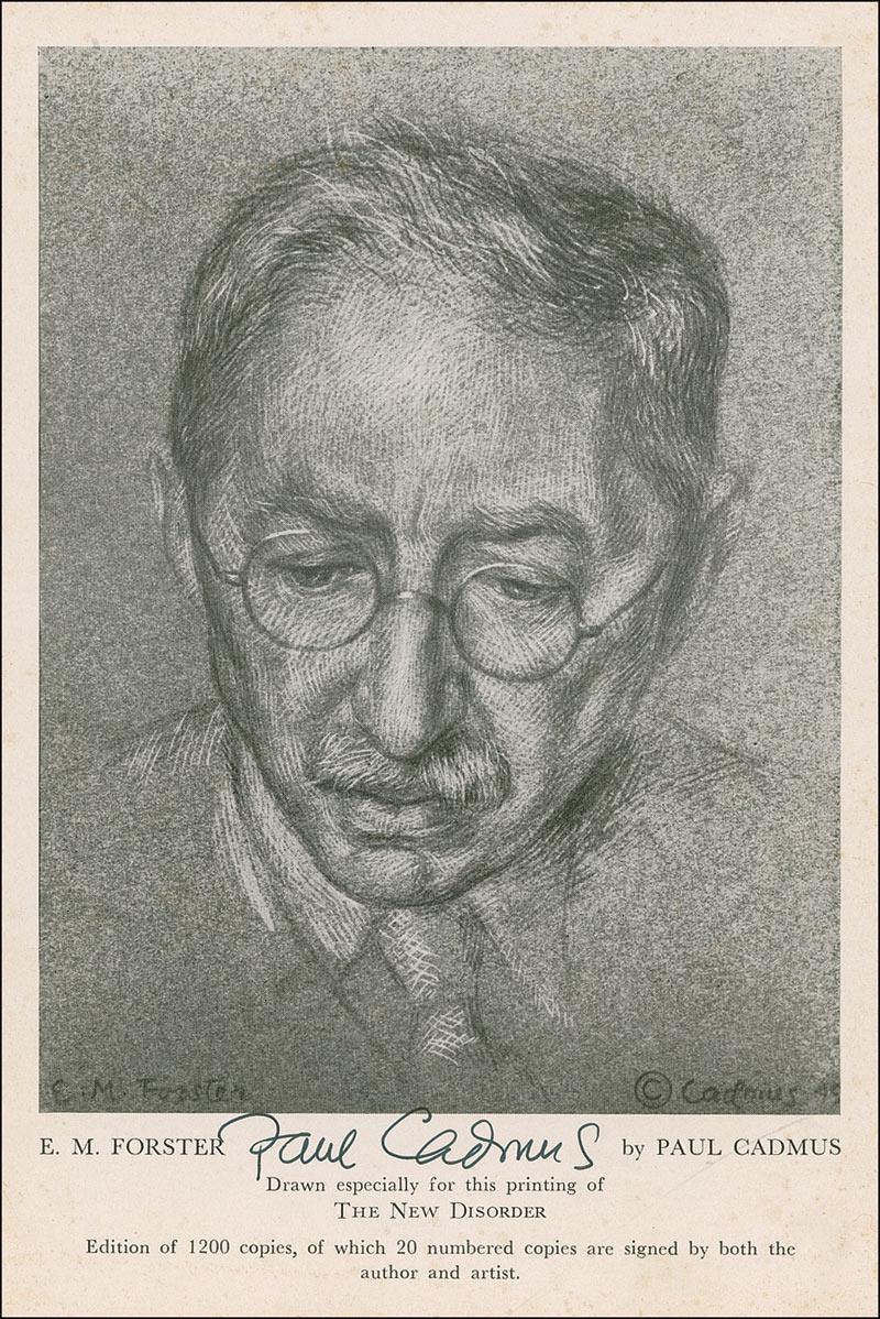 Four items: a typed statement concerning being an artist, one page, 5 x 6, signed at the conclusion by Cadmus. In part: “I think an artist is a favored person…In a way I created my own ivory tower. There was nothing grand about it.”; a satin-finish 5 x 3 photo, signed and inscribed in black ink; a 5.25 x 7.75 print of Cadmus’s drawing of E. M. Forster, signed in black ink; and a 7.75 x 5.5 cardstock print of two of his works, also signed in black ink. In fine overall condition.